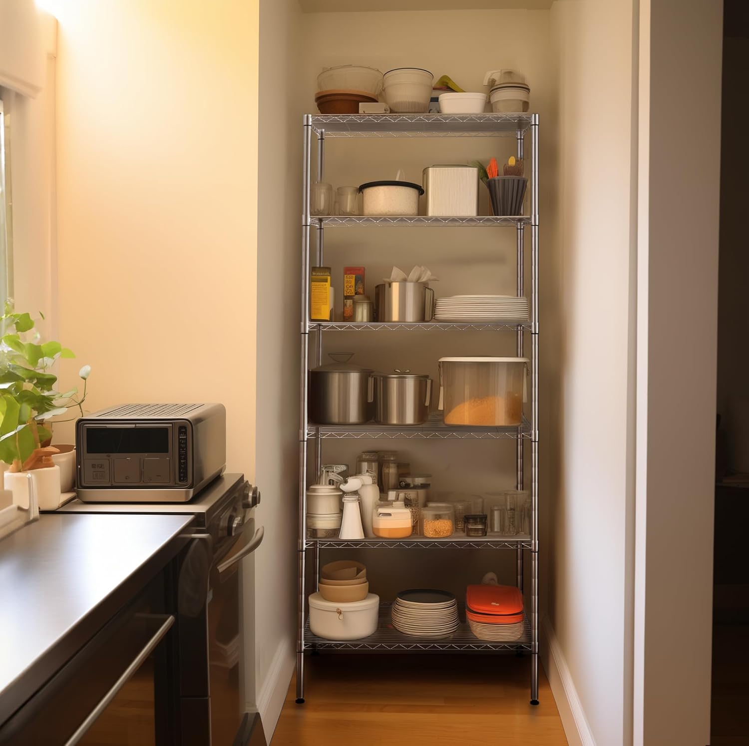 • RELIABLE & STURDY CONSTRUCTION - NSF Certified to ensure the quality. 250 lbs loading capacity per shelf with leving feet (evenly distributed) totally 1500 lbs, perfect for home use. Wire shelves adjustable in 1-inches to meet your different storage needs.