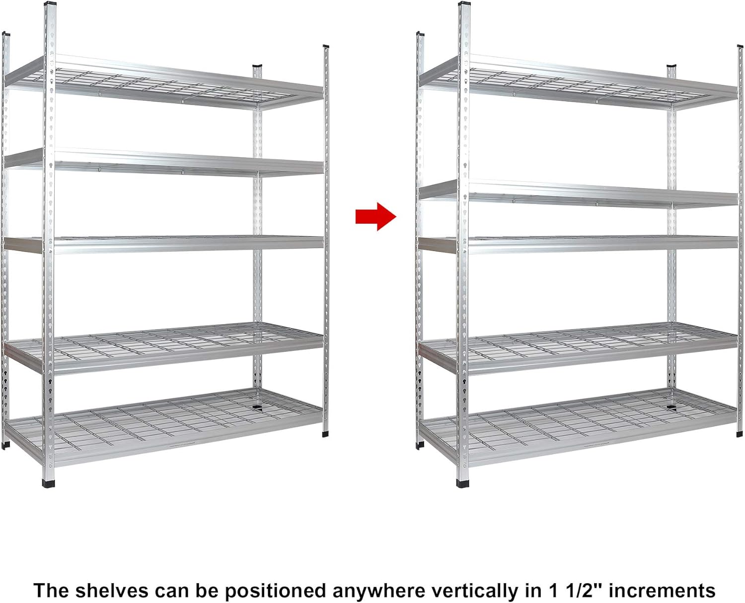 • Storage Unit dimensions (Together) – 24" W x 60" L x 78" H | Storage Unit dimensions (Separated) – 24" W x 60" L x 39" H | Shelves adjustment (Up & Down) – 1.5” increments | One single shelf can hold up to 800 lb, and the whole shelving unit can hold up to 4000 lb (when evenly distributed and on a level surface)