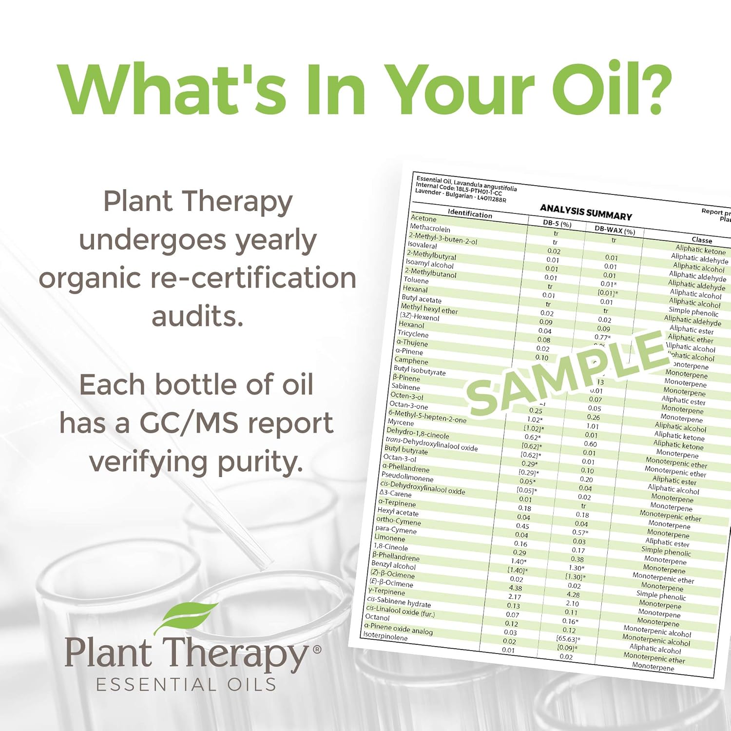 • BATCH SPECIFIC GC-MS REPORTS ON EVERY OIL: Every bottle of oil from Plant Therapy goes through multiple rounds of testing including organoleptic and multiple rounds of GC-MS testing by a third-party laboratory.