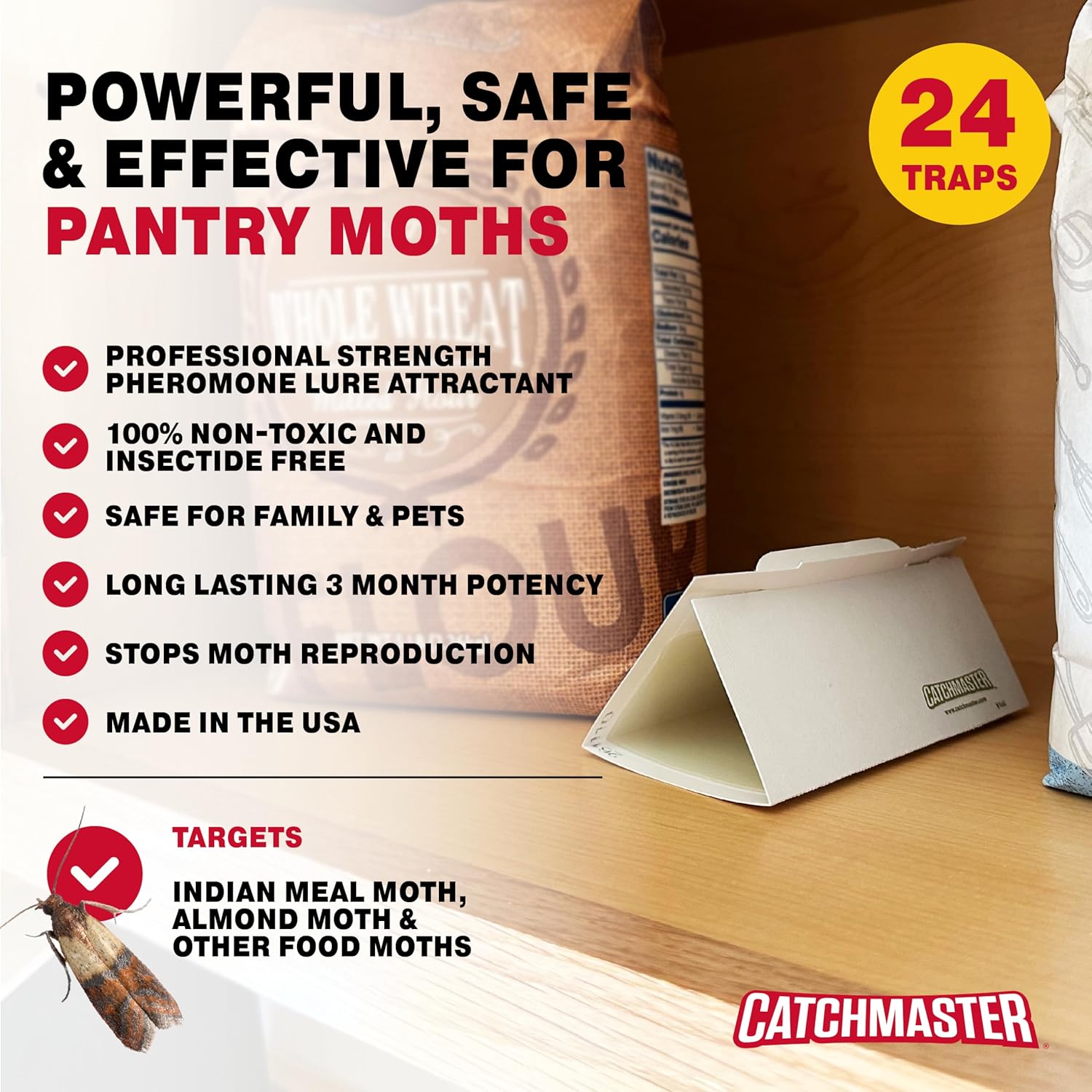 Catchmaster Pantry Pest & Moth Traps 24-Pk, Bug Killer for Kitchen Storage & Pantry Cabinet, Sticky Moth Traps for House, Protect Pet Food, Kitchen Cabinets Storage, Pet Safe Glue Trap