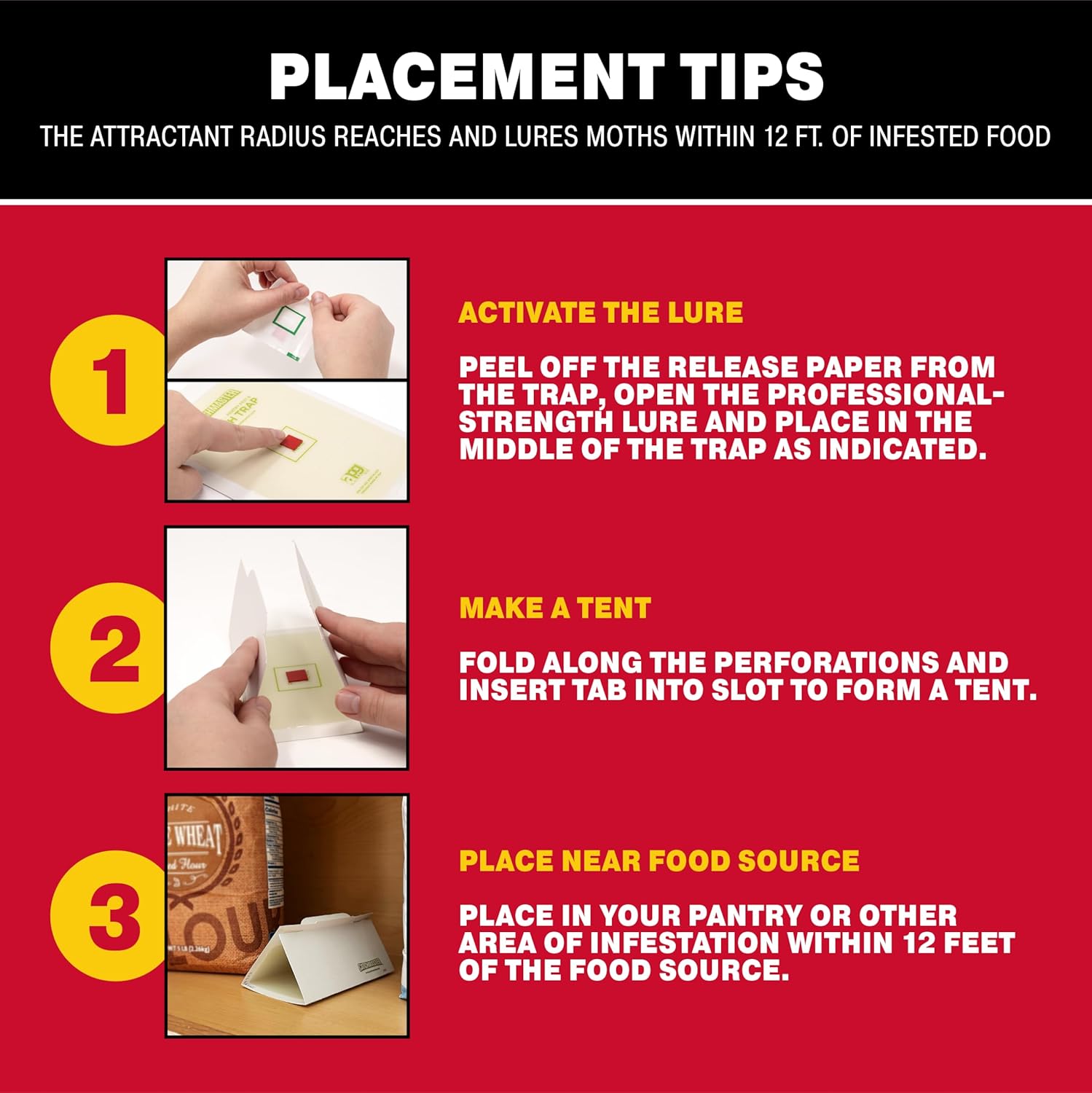• EASY TO USE AND MADE IN THE USA: Conveniently designed and ready to use, just place the pheromone attractant in the designated box on the glue trap and place the moth and bug sticky traps near food storage areas. The attractant radius reaches and lures moths within 12 ft. of infested food.