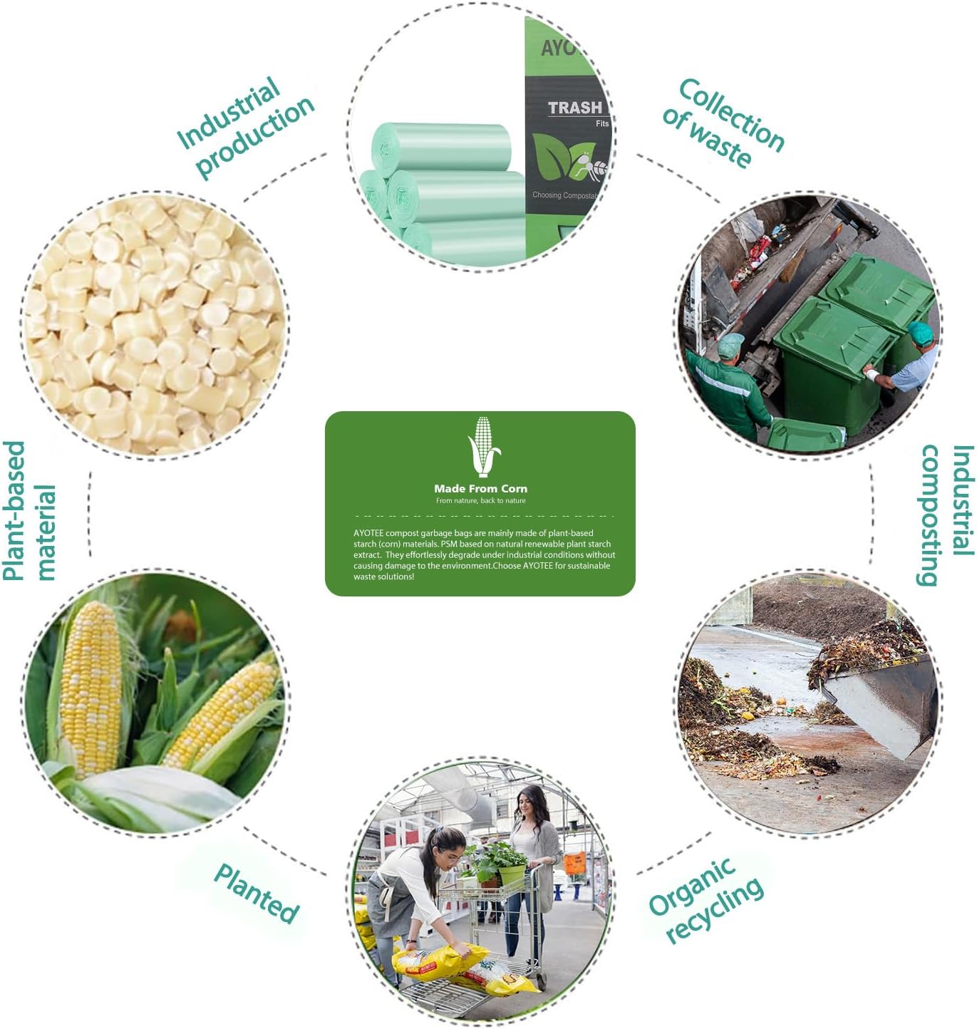 • Compost Trash Bags: The main materials for our small trash bags are made of Plastarch material(PSM), which is based on natural renewable plant starch extract. compostable, meets ASTM series standards. These small compost bags can be rapidly degraded in municipal industrial composting facilities (at 50-60°C constant humidity), to avoid harm to the environment