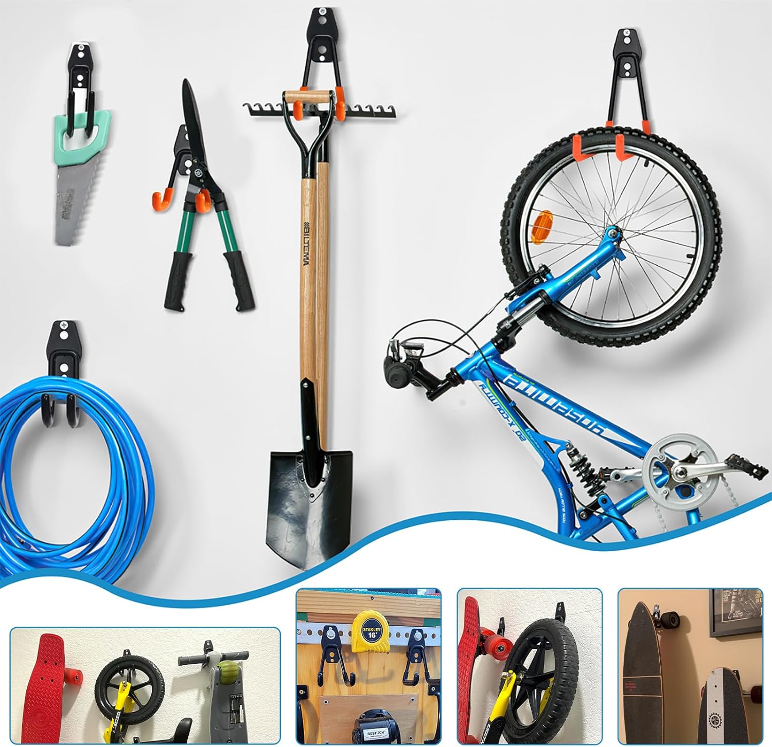• 【VARIOUS FUNCTIONS】Large Hook is a flexible wall mounting solution for bikes, cables,hoses, spade, broom, wrench, stroller, skates, gym bags, shovel, rakes, kayak, sports equipment, sawhorses, and electrical cords,gym bars, Body Training and core strength builders and other items.
