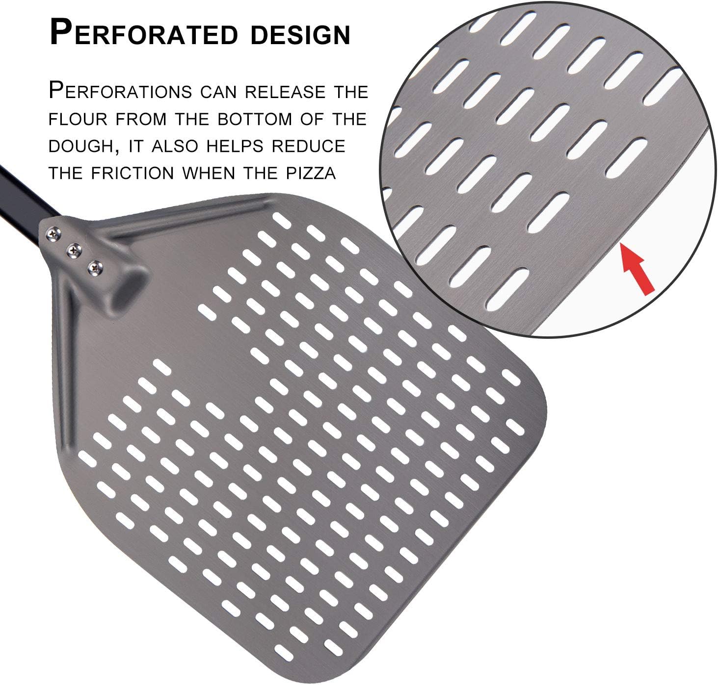 • 【RECTANGULAR PERFORATED HEAD】The 12" x 15" milled aluminum head boasts a beveled edge for easy handling, allowing pizzas to slide in smoothly. The perforated design of pizza spatula reduces the need for excessive cornmeal or flour, ensuring your pizza comes out crispier and more flavorful, with less sticking