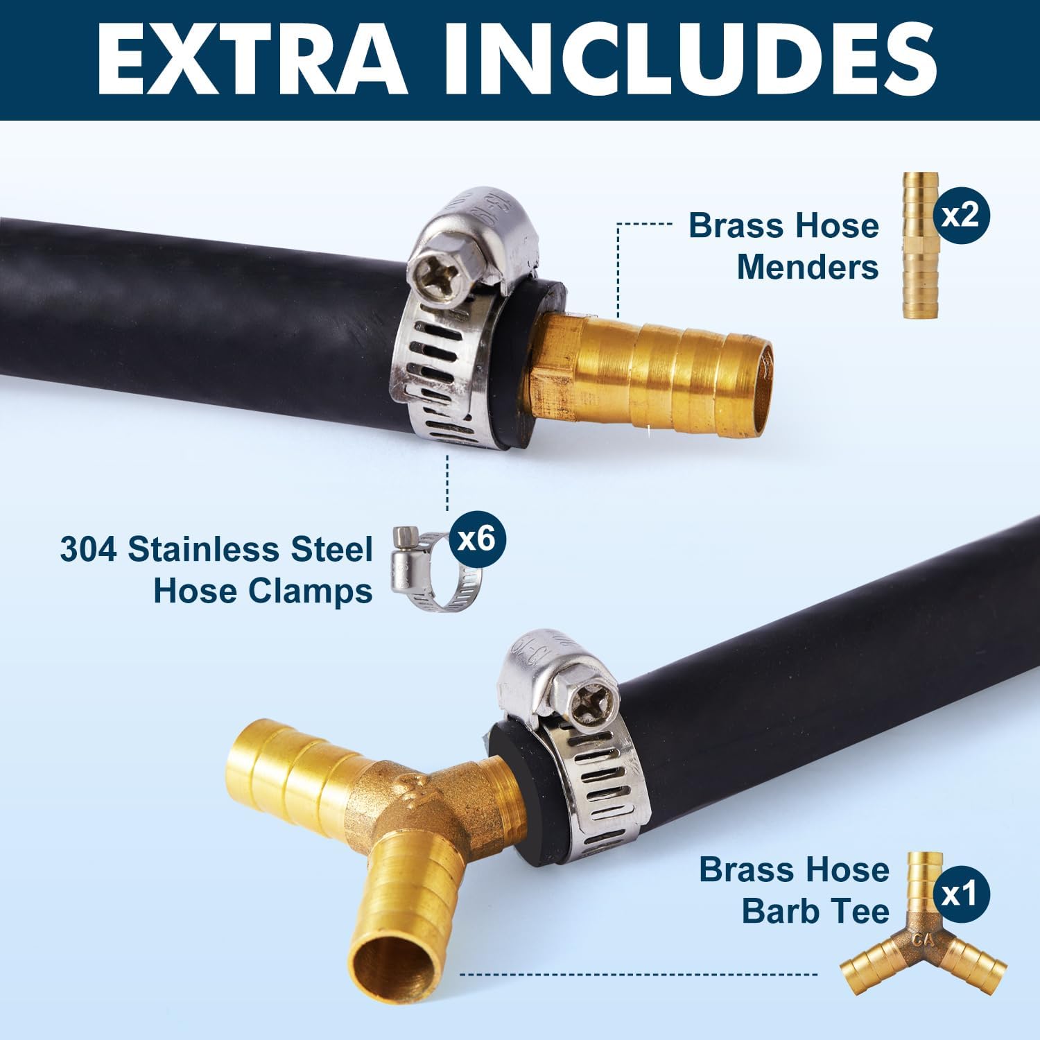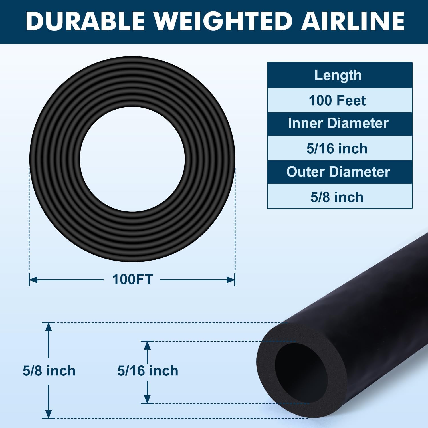 • 100ft, 5/16" ID, 5/8" OD self-sink rubber air hose One roll. 10 hose clamps, 1 tee brass barb fitting, 2 straight barb fittings included.