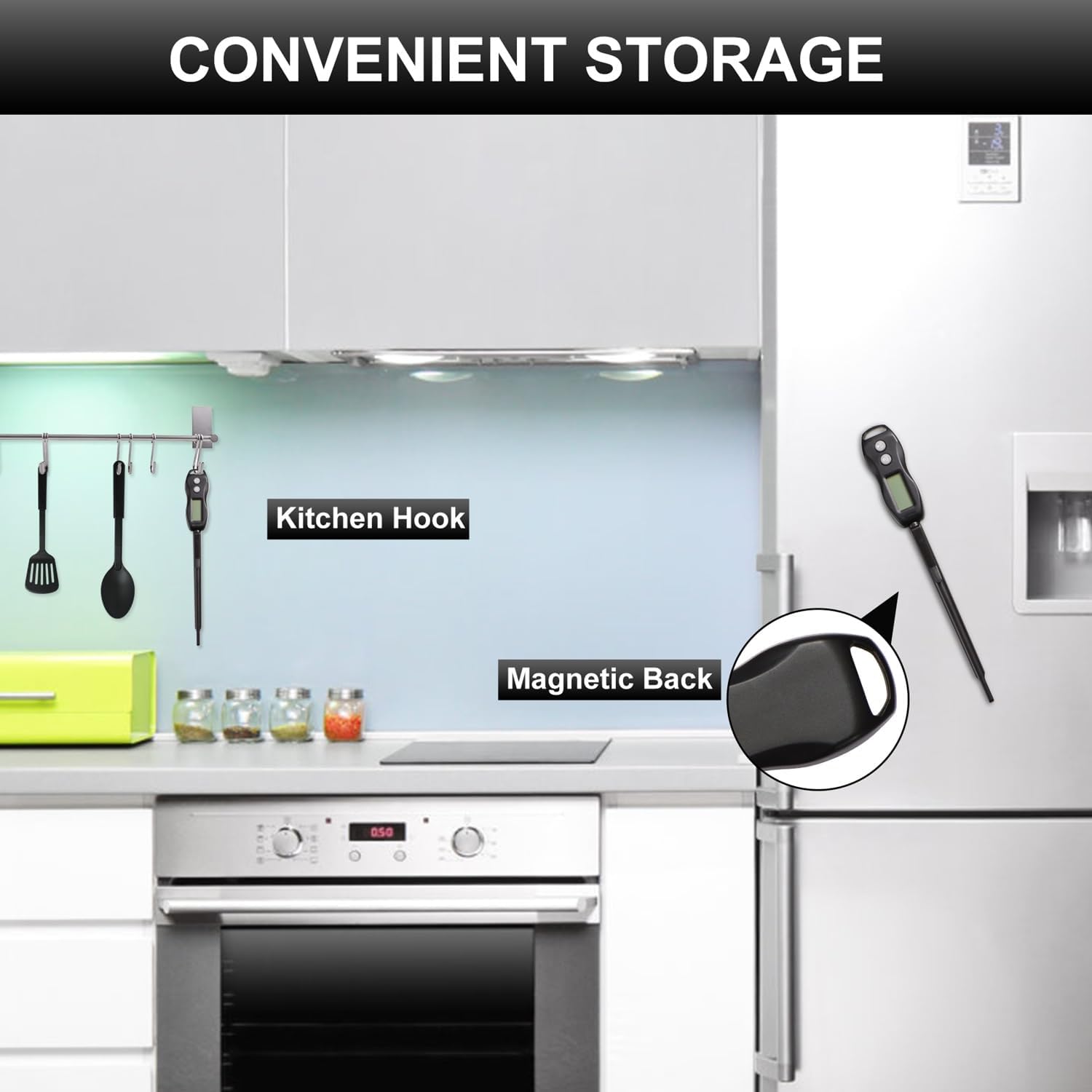 • [Easy to use] Simply insert probe into your food or liquid and wait for 2-3 seconds until final temperature is displayed; Built-in Magnet; IP66 Rated Waterproof; Probe length is 5.3 Inches