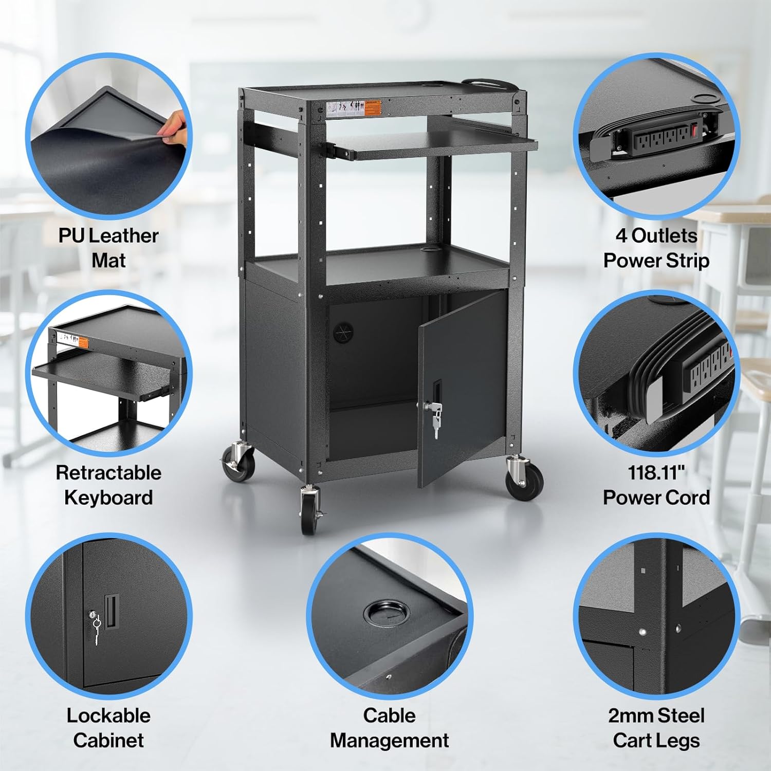 • MULTIPURPOSE: Our projector cart comes with a built-in power strip with 4 outlets, a 118.11" power cord to charge multi devices over long distances. Equipped with a pullout tray, PU leather mat and cord management wrap to enhance your using experience. The practicality of this rolling computer cart can also be use as standing desk, mobile laptop work station or mobile home office.
