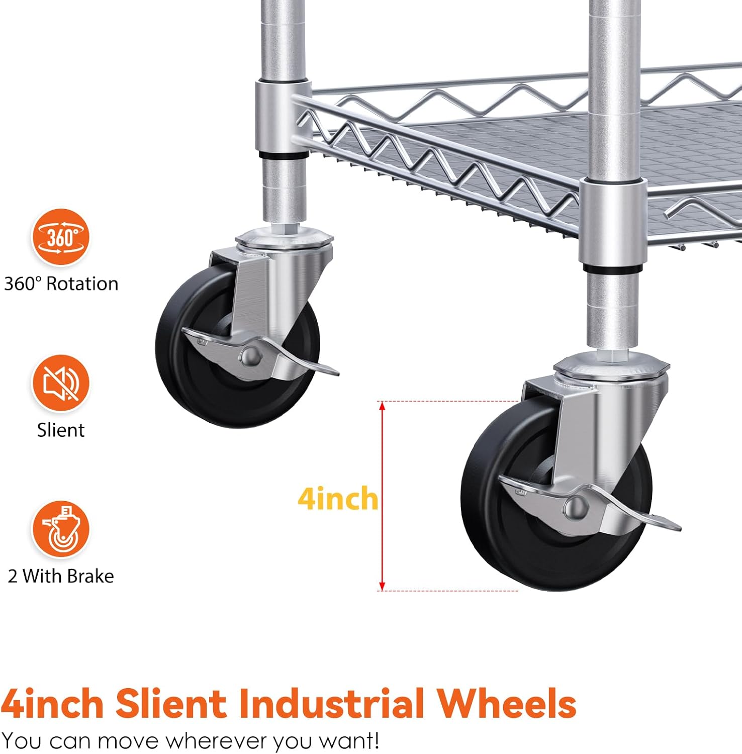 • Sturdy And Durable Rolling Cart: WDT utility cart on wheels made of chrome-finished steel for strength, durability, and to resist dirt buildup and corrosion. The rolling kitchen cart includes 4 wheels for mobility, 2 lock wheels for added stability.