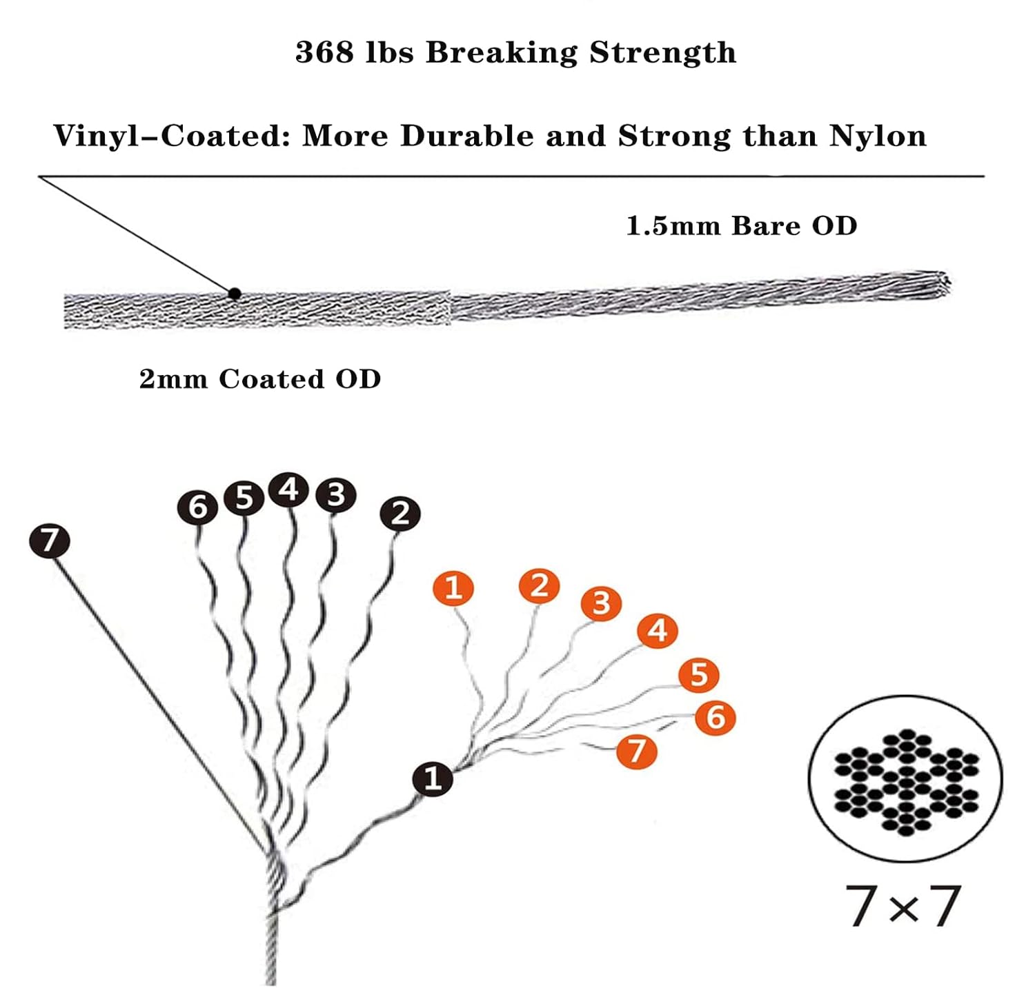 • 【High-strength Vinyl Coated Aircraft Cable】:The stainless steel cable bare OD is 1.5mm, coated OD is 2mm, with 7X7 construction, that you can easily trimmed to any desired length. Once the cable is pulled tightly, it is sturdy enough to hang the heavy string light in a large open area without sagging.