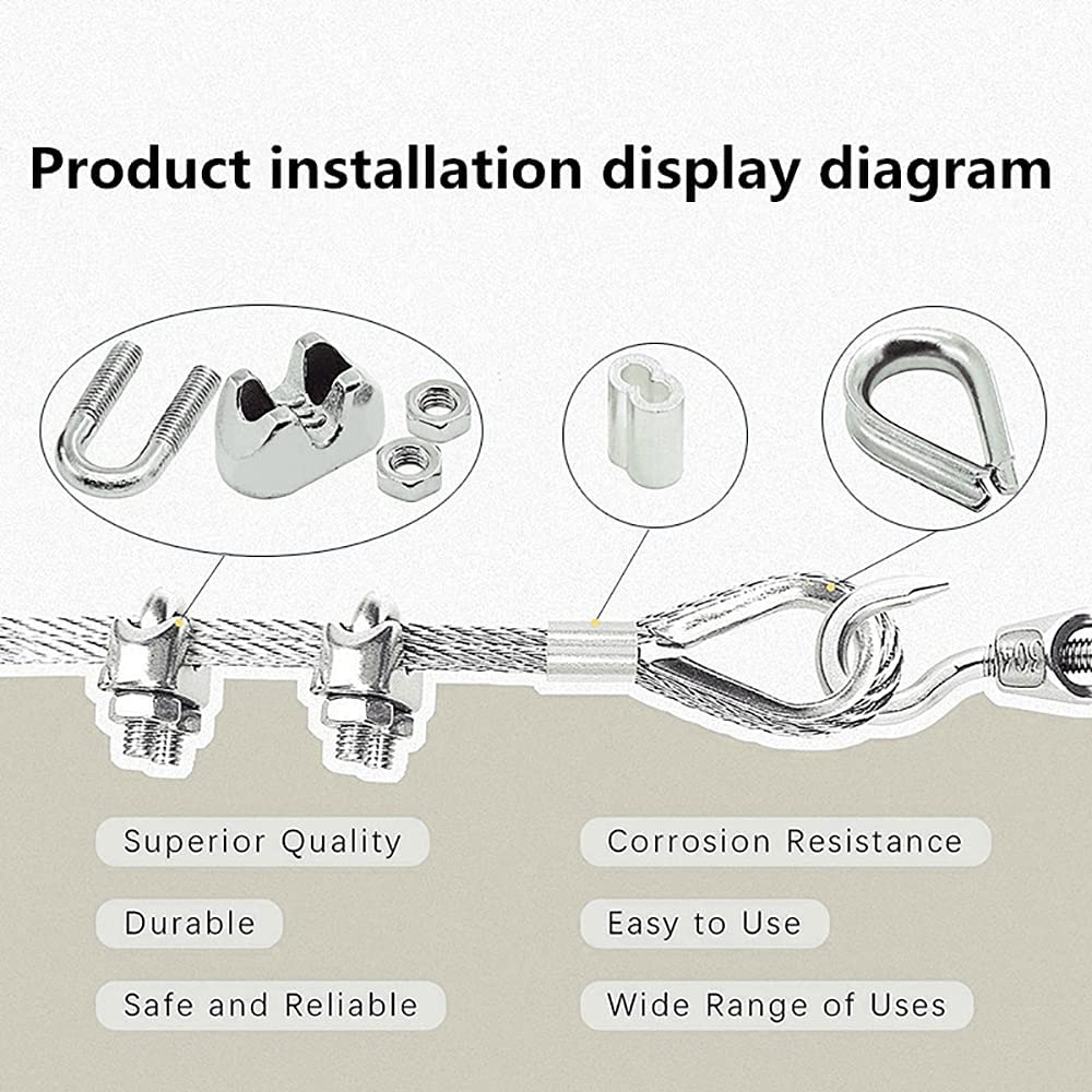 • 【Packaging Information】: Including x 15m/50ft Vinyl Coated stainless steel wire rope,2 x M5 Turnbuckle Tensioners,4x M2 Card header,10 x M2 aluminum sleeve, 4 x M2 thimble, , 4x M6 Sheep eye screw hook 65mm, 4 x plastic anchors