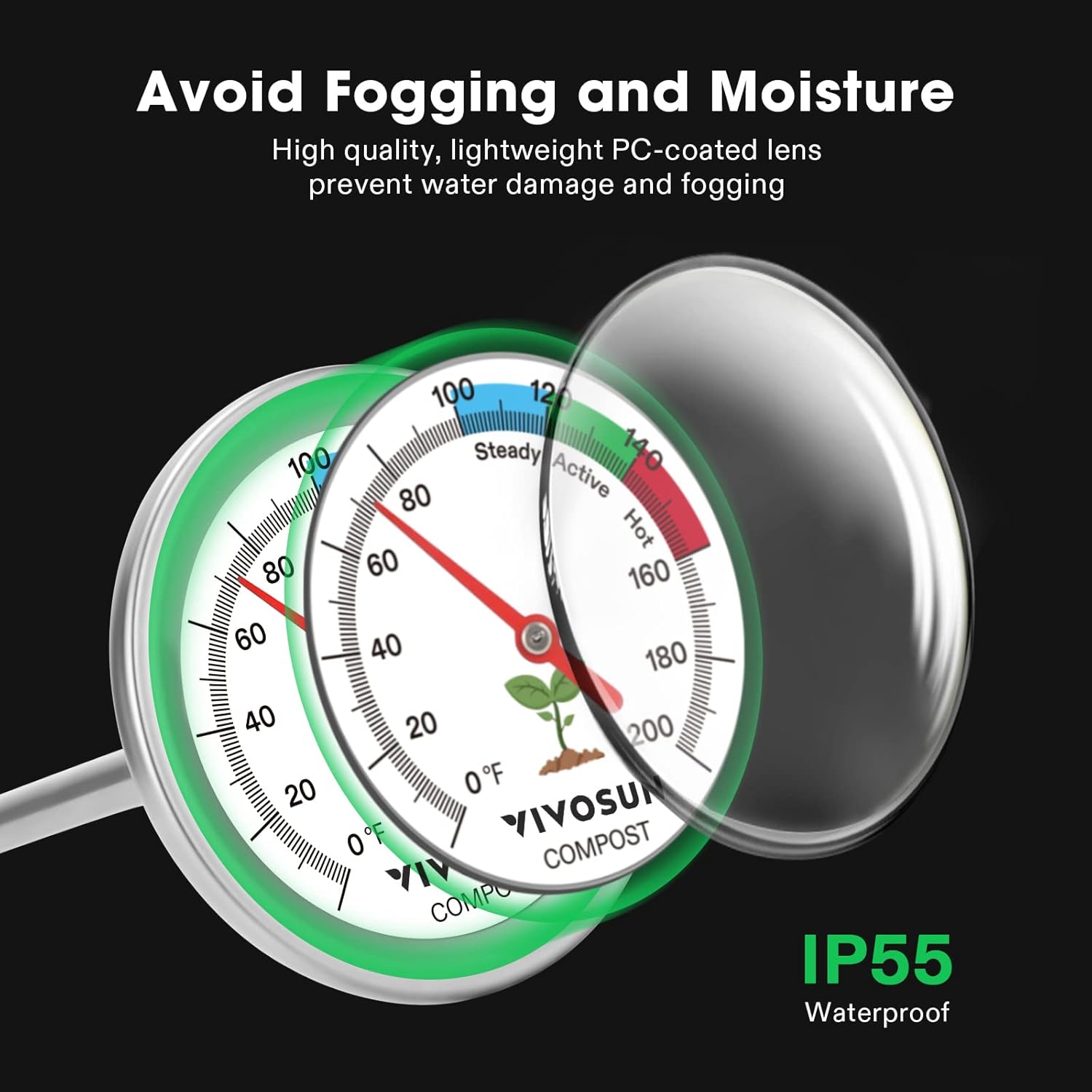 • Accurate & Clear Reading: IP55 waterproof PC-coated lens is sealed to keep out moisture and avoid fogging for easy & clear reading; Only ± 2°F accuracy so you know your compost pile’s true condition and can optimize accordingly