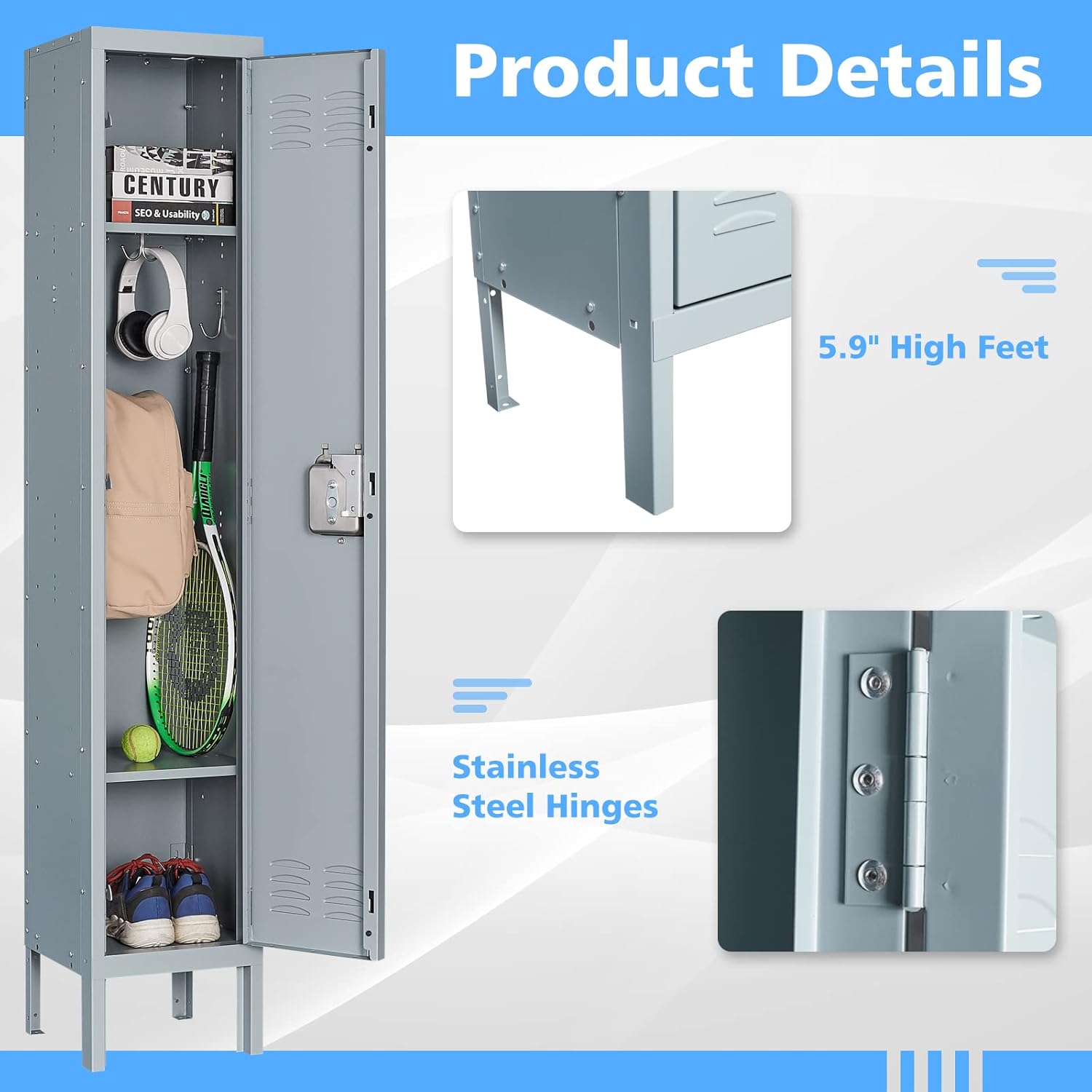 • Multiple Uses: Metal storage can easily blend with most of places, such as gym room, bedrooms, classroom, porch, dressing room. This metal locker has 5.9" high legs to prevent moisture