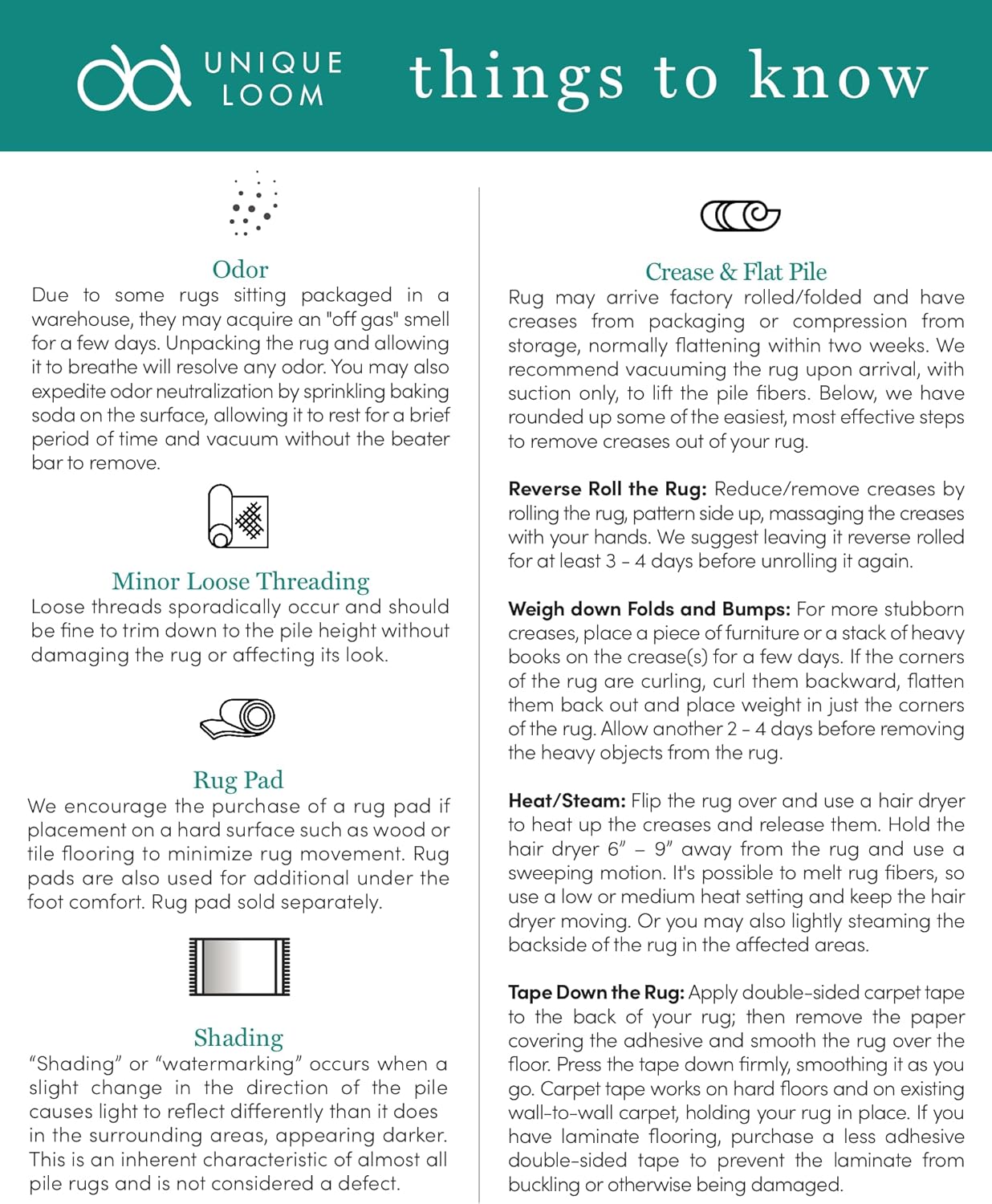 • SHIPPING: Rug will arrive factory rolled/folded and may have creases from packaging & compression from storage, flatting over time.