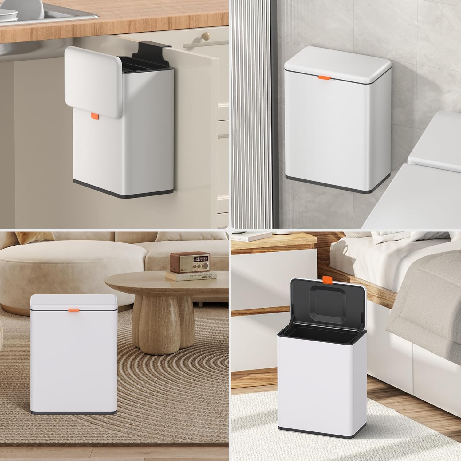 • 【WALL MOUNTED/COUNTERTOP/ UNDER SINK TRASH CAN】: No need to bend over. The trash can provide Two opening and installation methods,Effortless and Fits for Most Cabinet Doors, Pantry Doors. The thickness of door should be less than 0.98" (2.5cm). Small trash can can also be glued on kitchen or bathroom wall or under the sink.