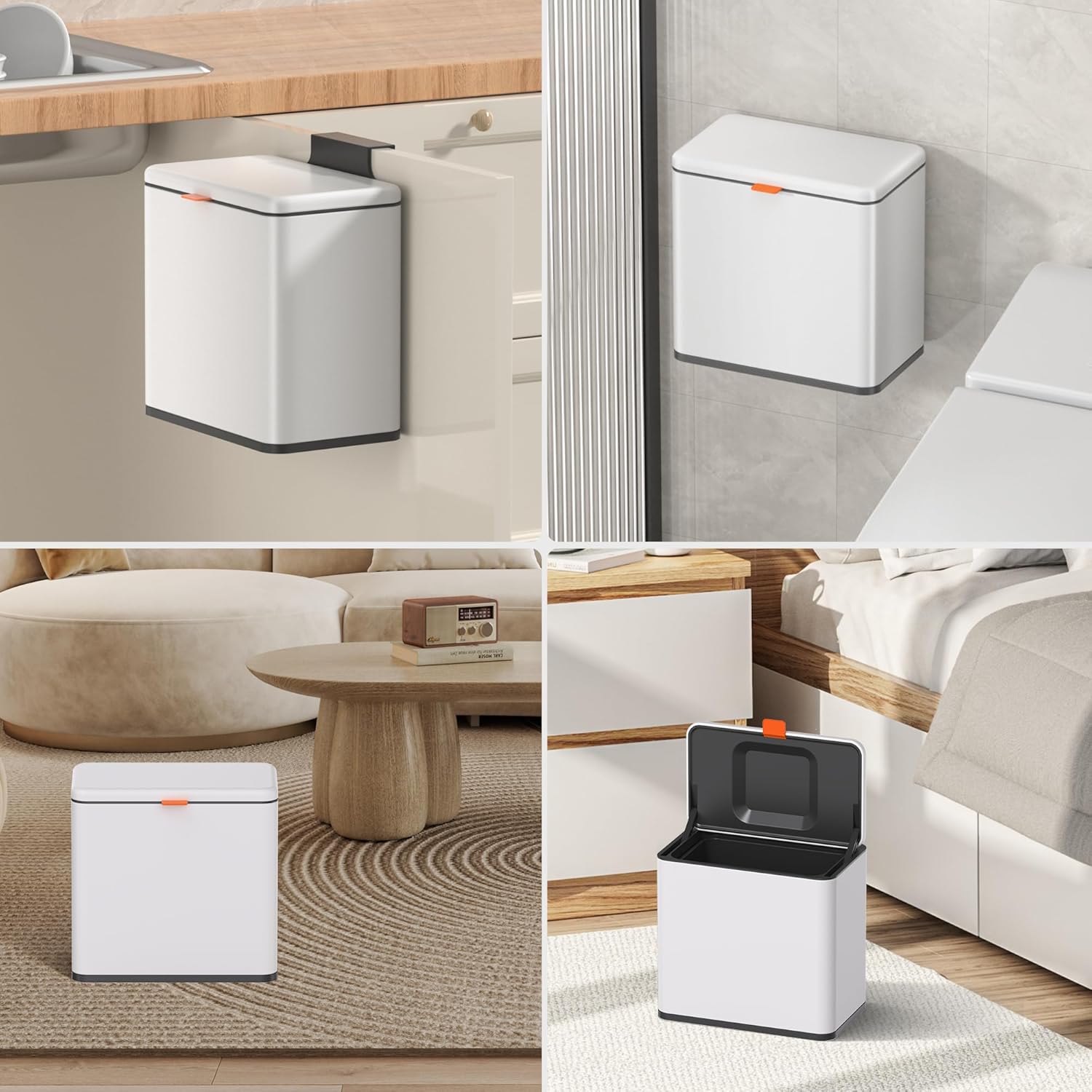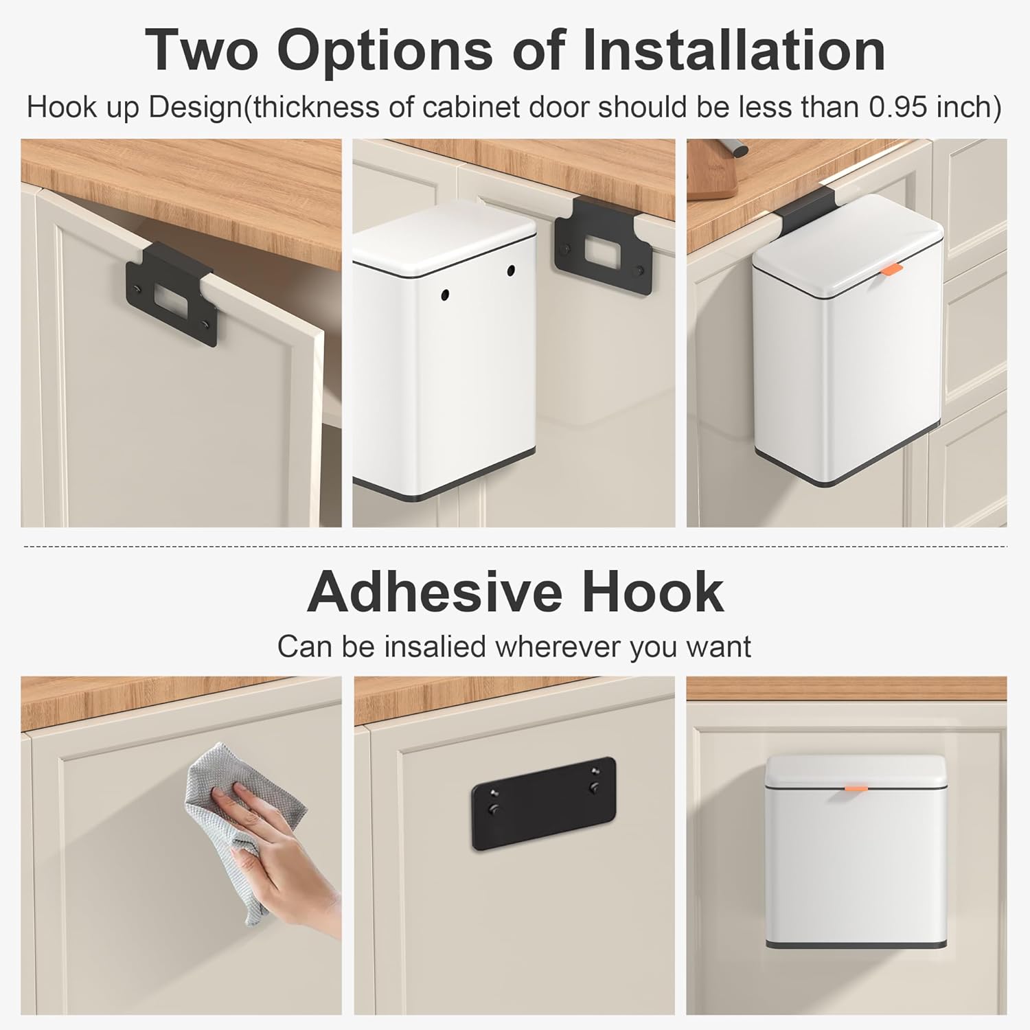 • 【WALL MOUNTED/COUNTERTOP/ UNDER SINK TRASH CAN】: No need to bend over. The trash can provide Two opening and installation methods,Effortless and Fits for Most Cabinet Doors, Pantry Doors. The thickness of door should be less than 0.98" (2.5cm). Small trash can can also be glued on kitchen or bathroom wall or under the sink.