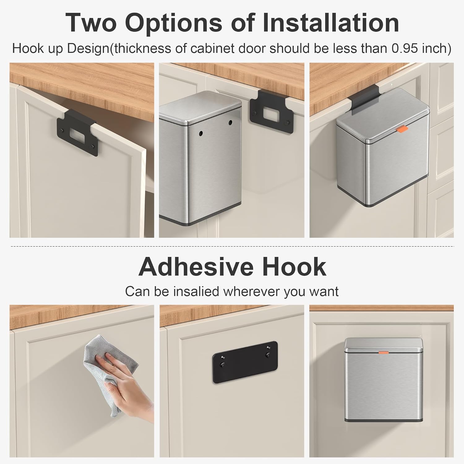 • 【WALL MOUNTED/COUNTERTOP/ UNDER SINK TRASH CAN】: No need to bend over. The trash can provide Two opening and installation methods,Effortless and Fits for Most Cabinet Doors, Pantry Doors. The thickness of door should be less than 0.98" (2.5cm). Small trash can can also be glued on kitchen or bathroom wall or under the sink.