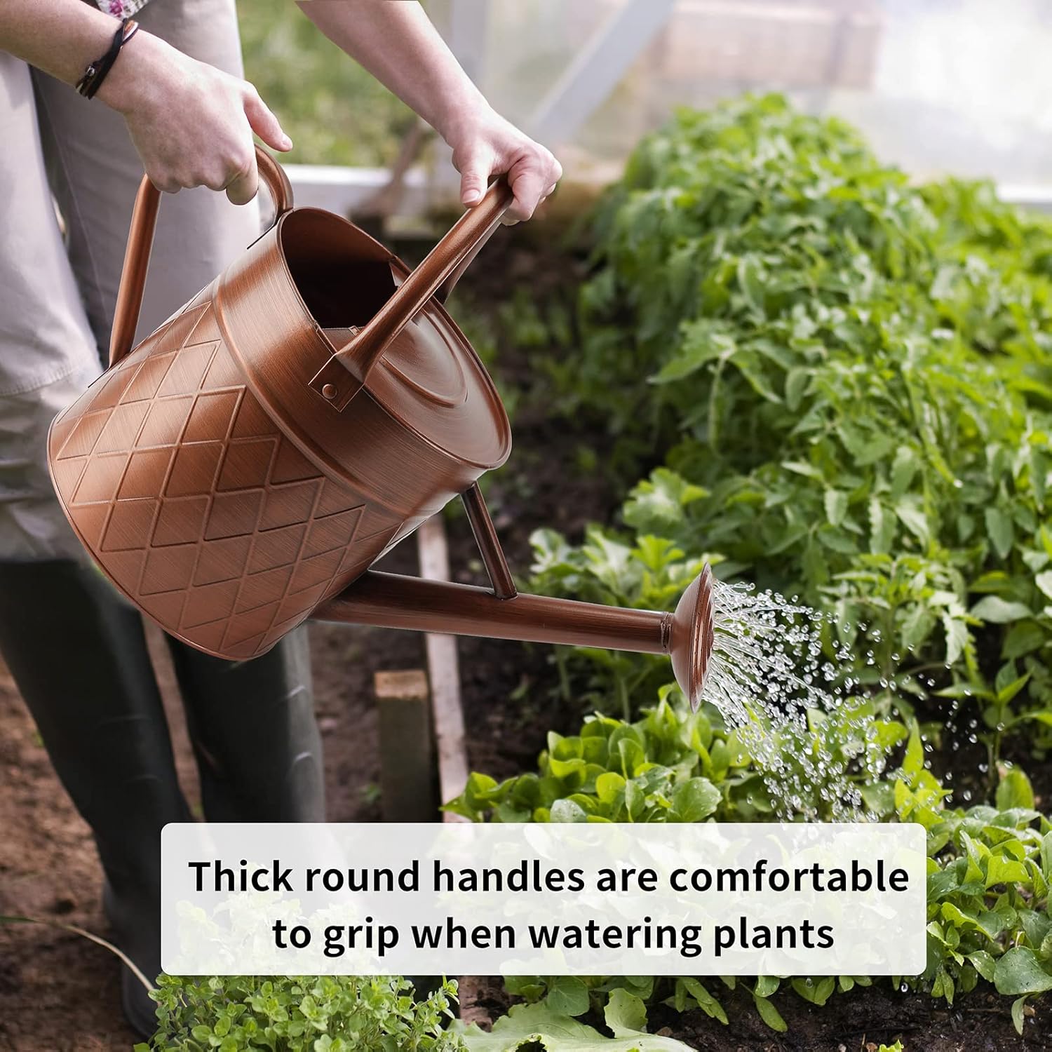 • The unique diamond pattern design on the surface adds a touch of personality and character to the watering can. It not only serves as a practical tool for watering plants, but also doubles as a decorative item for your garden or indoor plants.
