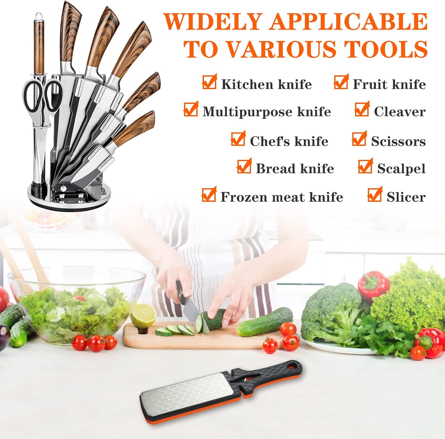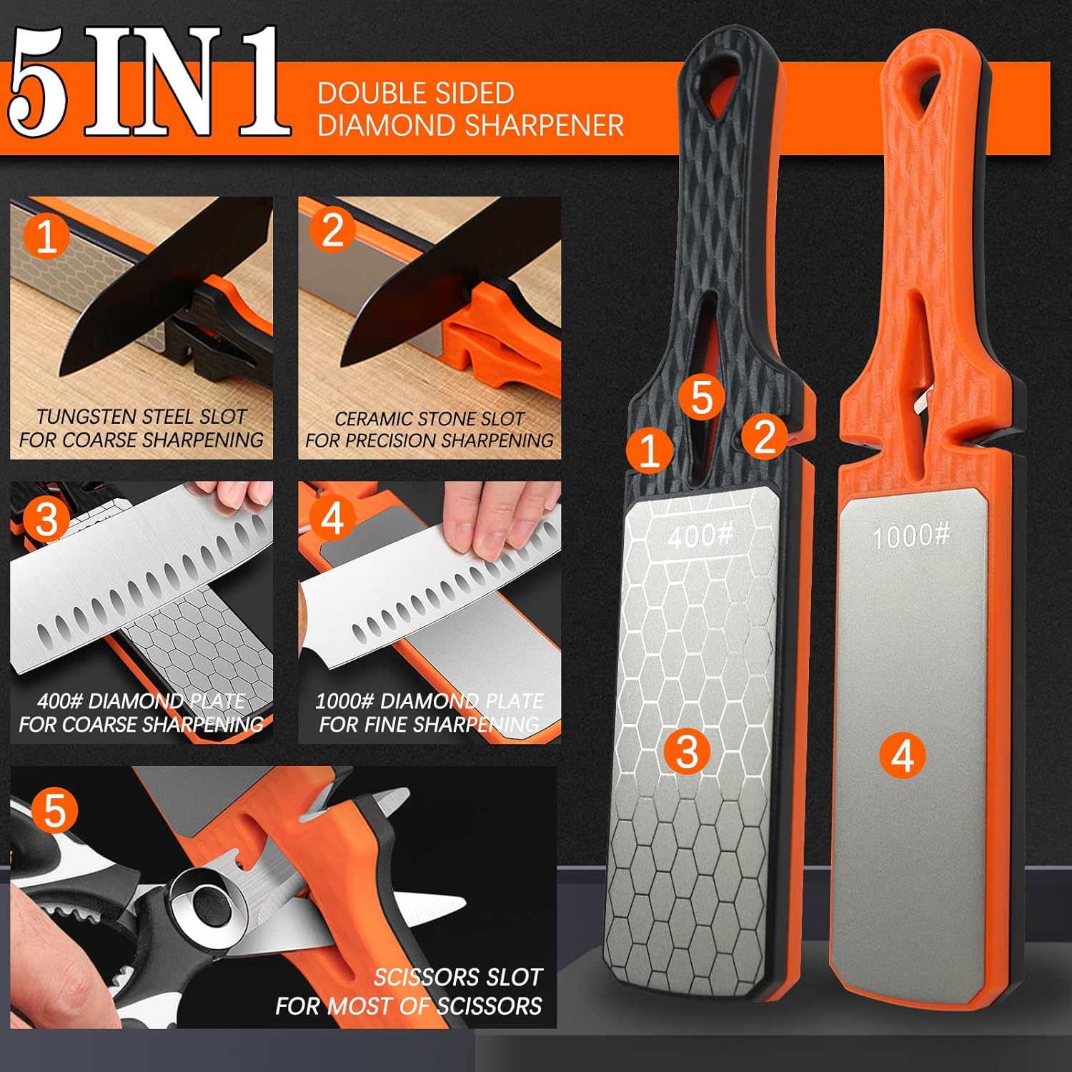 • 5 in 1 Sharpening Stone:The front side 400# coarse sharpening is used to repair severely dulled blades, and back side 1000# fine sharpening is used to re-sharpen the edges and deburr the blade. The lightning slot in middle of handle is for Scissors Grinding.Left waist of the handle is tungsten steel blade sharpens to restore the knife's V-shape,and the right waist of the handle is ceramic blade sharpens for polish and eliminates burrs on the metal blade.