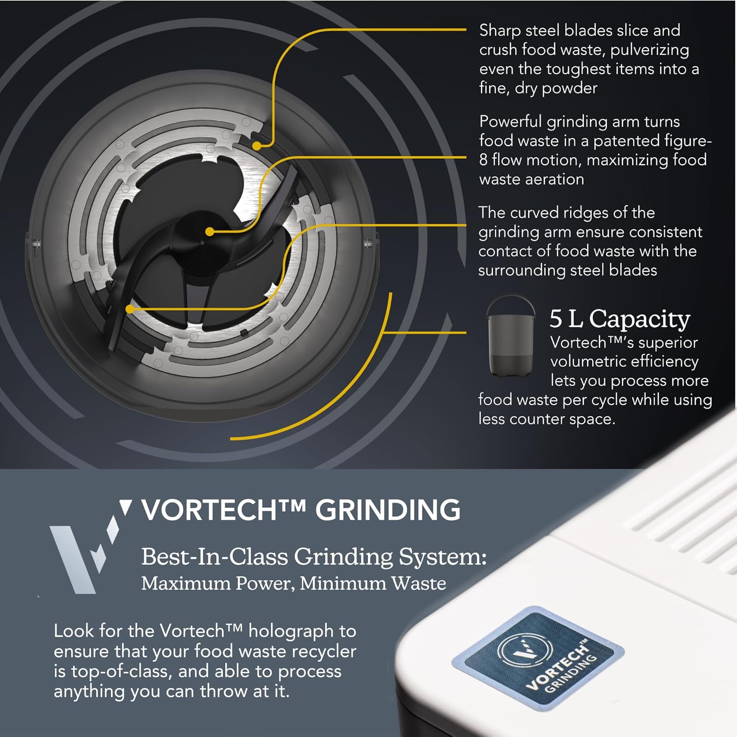 • INNOVATIVE VORTECH SYSTEM: The Eco 5’s Vortech(TM) patented grinding system can grind what others can't. Toss in your pits, peels, bones, leftovers! Vortech's efficiency means the FoodCycler indoor electric composter alternative consumes less power than your average clothes dryer.