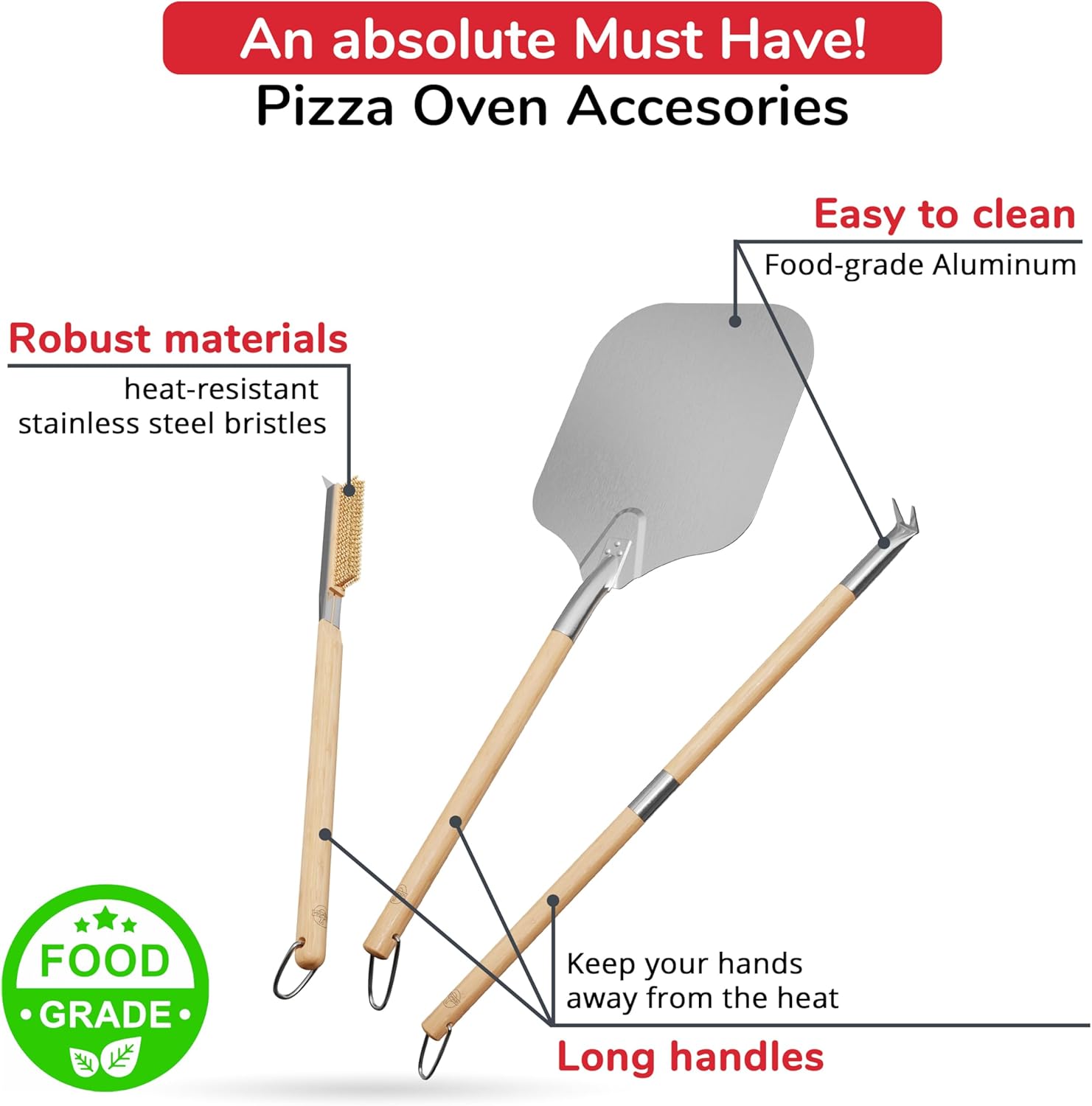 • Built for Safety and Convenience: Each tool features extended handles (32" turner, 26" brush, 32" total peel length) keeping hands safely away from heat while providing excellent control during cooking and cleaning.