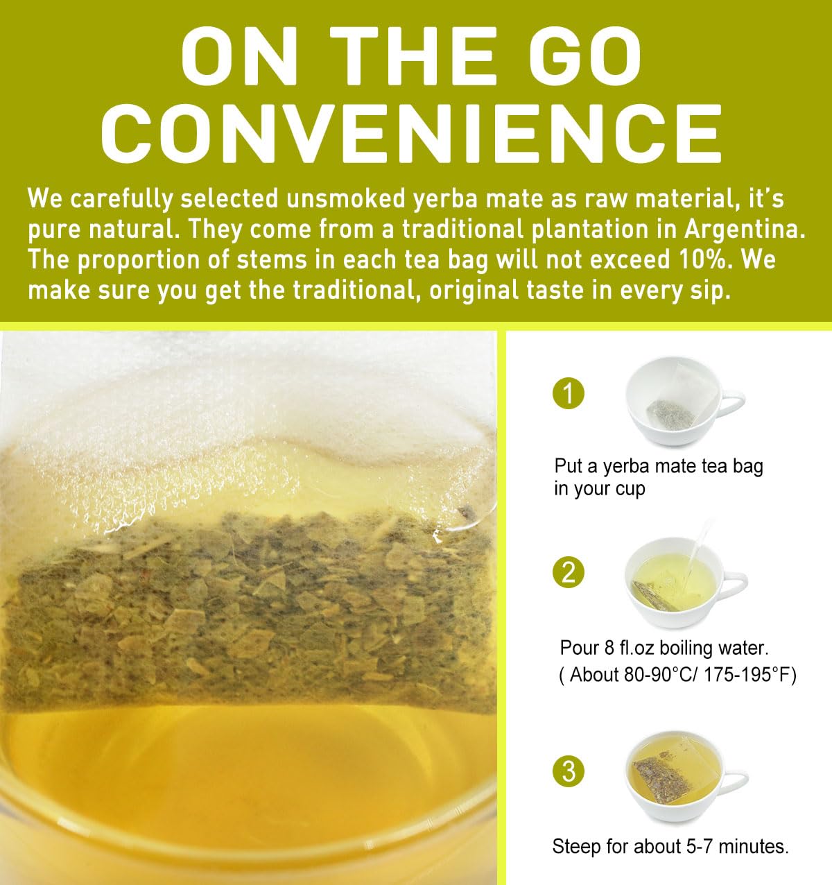 • EASY TO USE: There are 60 yerba mate tea bags are placed in a resealable bag to keep them fresh. Just take one and place it in the cup, add 8 fl.oz of boiling water. Steep for about 5-7 minutes. Take out the tea bag then enjoy this tea;