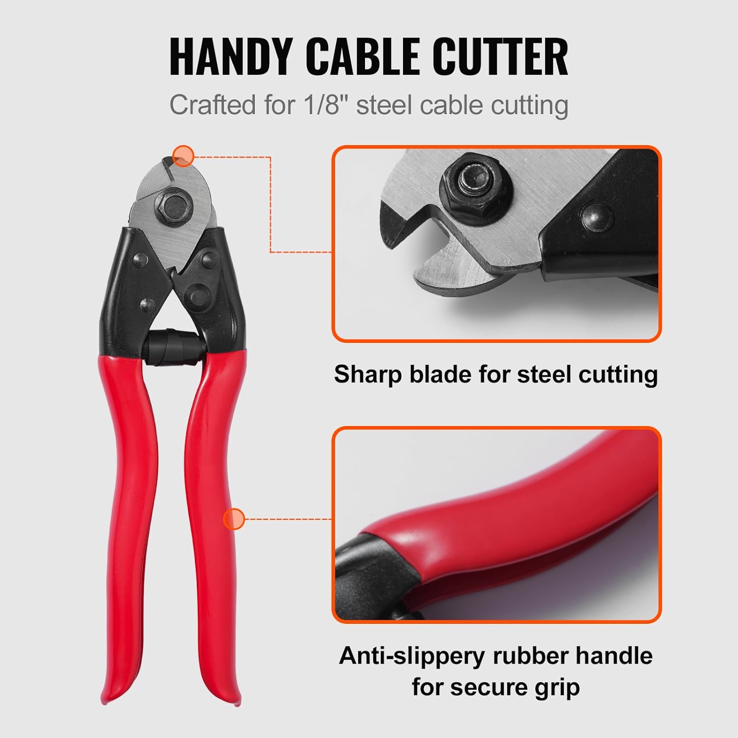 • Cable Cutter Kit: VEVOR aircraft cable comes with the 300 ft cable and a cable cutter that cuts up to 1/8" diameter rope. It works flawlessly for cable-length cutting and leaves a clean wound on the cable. Anti-slippery rubber grip works for a safer operation.