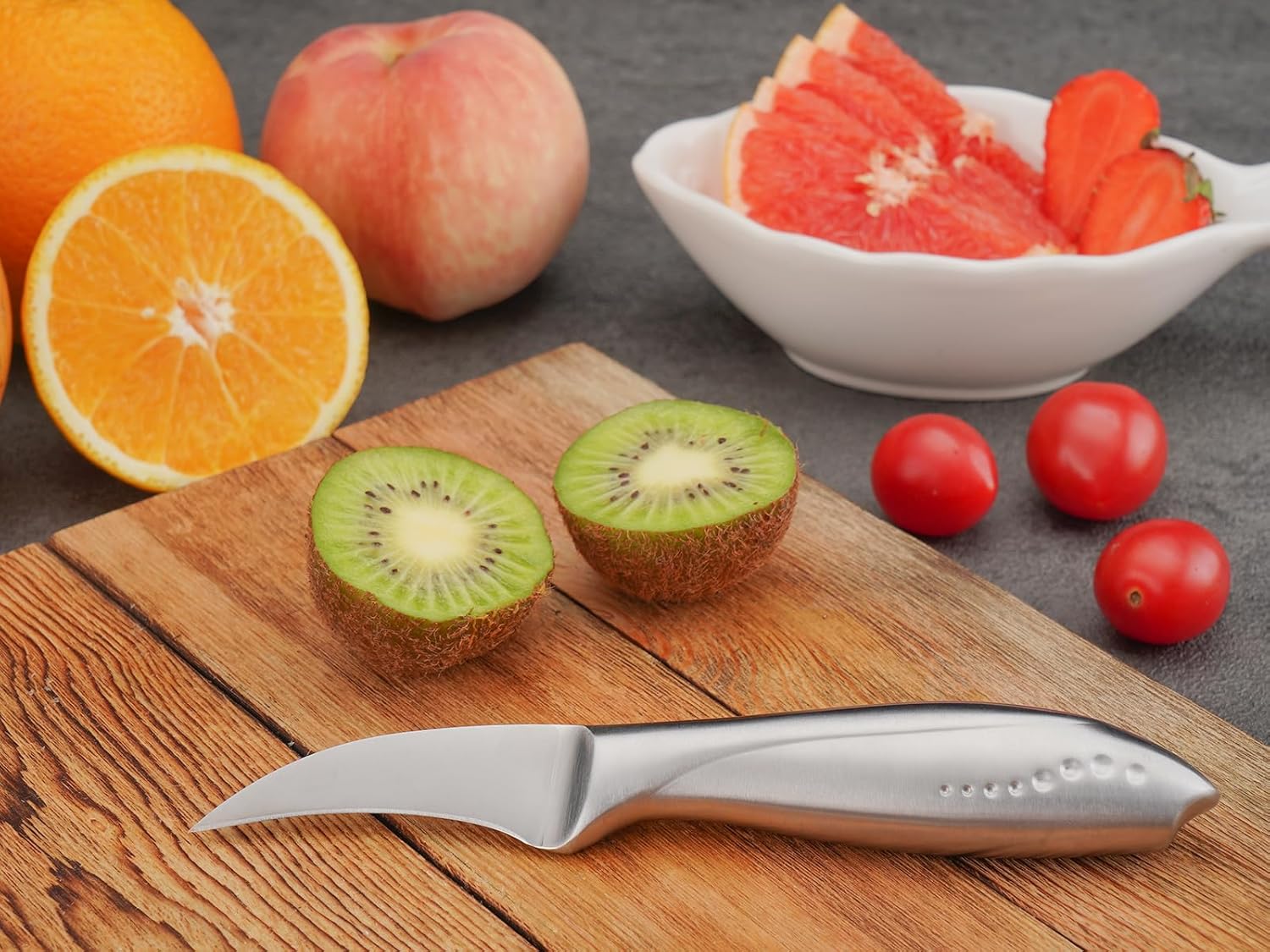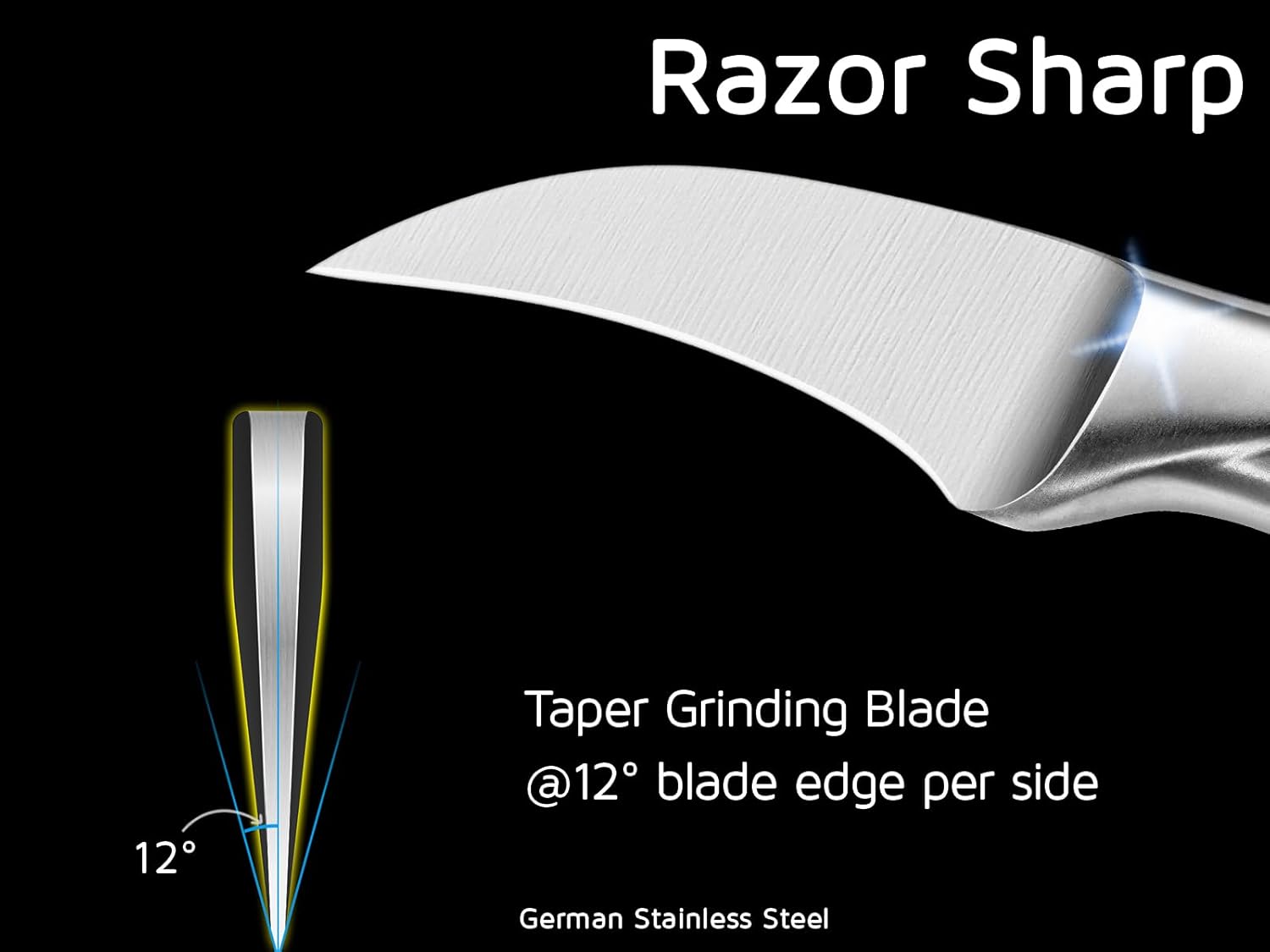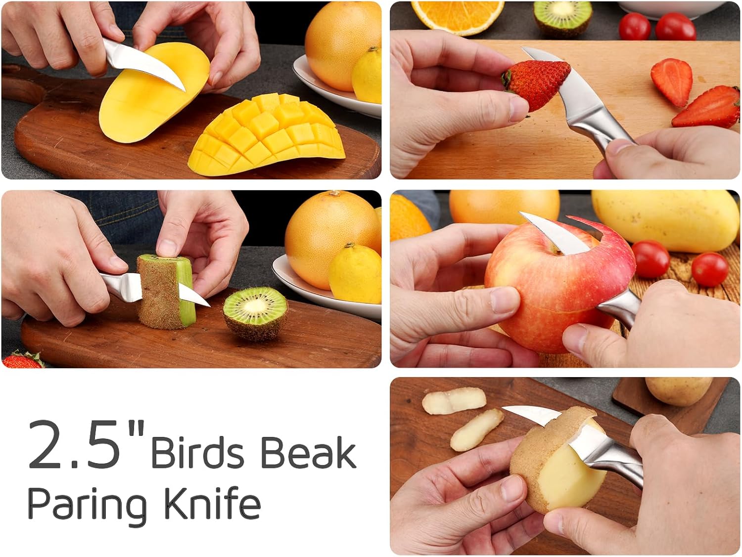 • 【SUPER SHARP GERMAN STEEL BLADE】The bird’s beak paring knife is precisely forged of premium German Stainless Steel DIN1.4116, hardness up to HRC56±2. The 12-degree blade edge per side ensures maximum sharpness, ideal for peeling fruits and vegetables, removing blemishes, and creating beautiful garnishes.