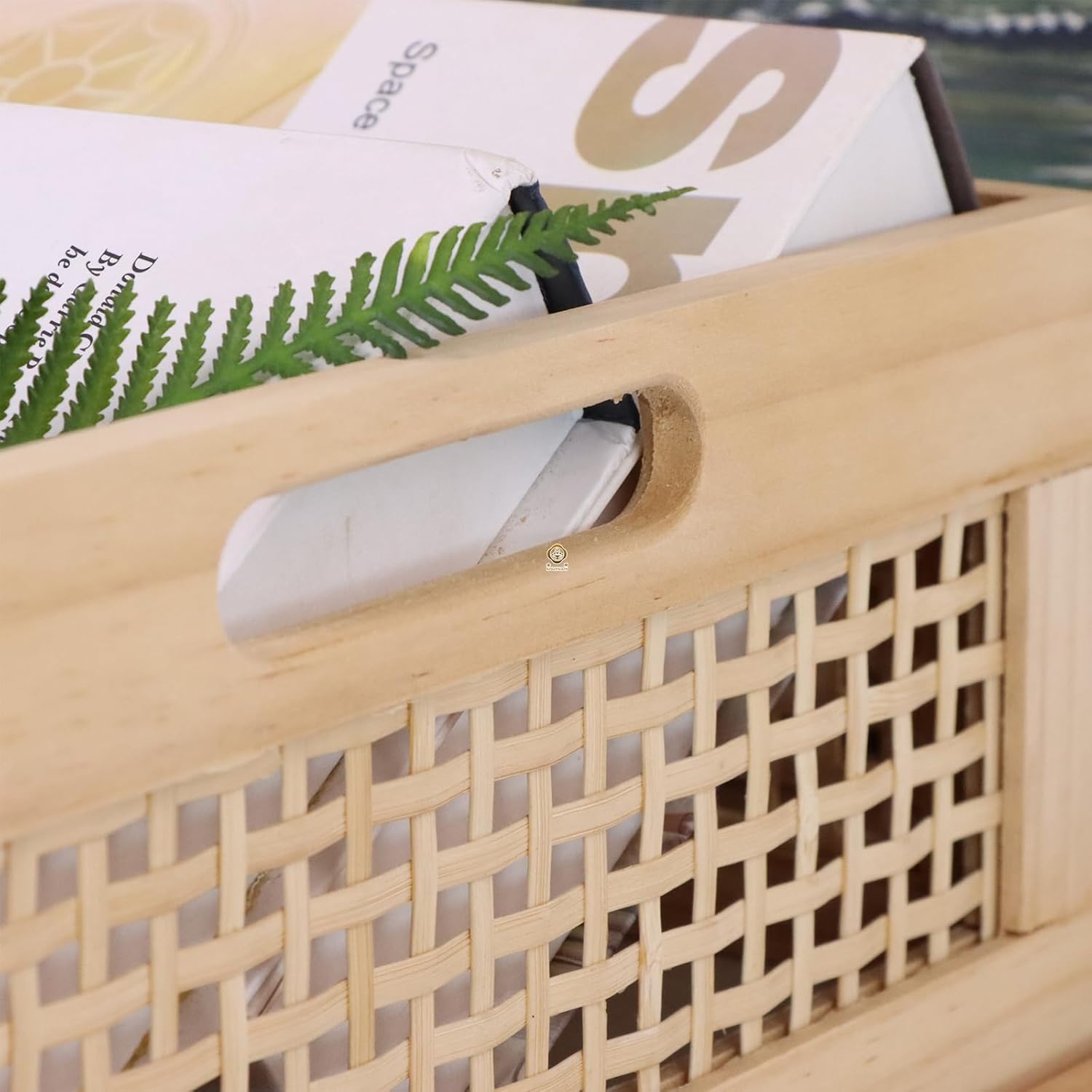 • [Natural Material] This wood storage basket made form high quality wood frame with bamboo net side decor. The sturdy construction ensures it can hold a variety of items, and it adapts to your needs, making it a versatile and stylish home accessory.