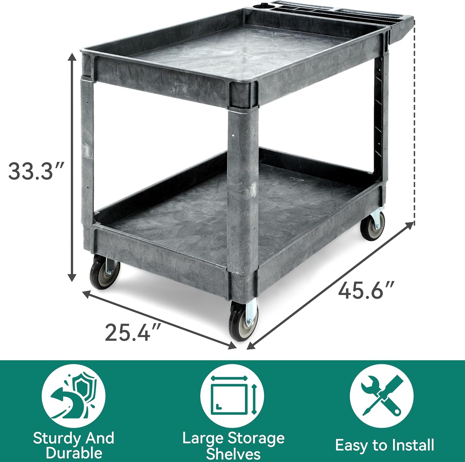 • 3-STEPS INSTALLATION: The package comes with professional installation instructions, you don't have to worry about the installation at all.Utility carts with wheels size description: 45x25x33.3 inches, Load Capacity: 550 lbs, Number of Layers: 2 layers. With this extra large heavy duty work cart, you can store more and push it easily.