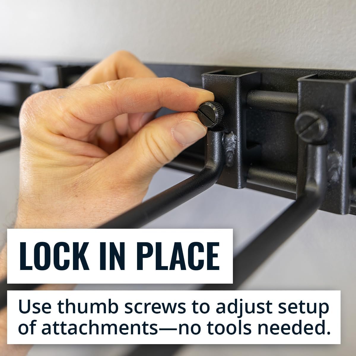 • INCLUDES 48" STORAGE RACK SYSTEM – Features modular wall hangers and wall shelves with expandable hooks that create a complete garage wall organizer. Dimensions: 48" wide with multiple tool storage organizer slots to secure yard tools, broom holder wall mount, and more.