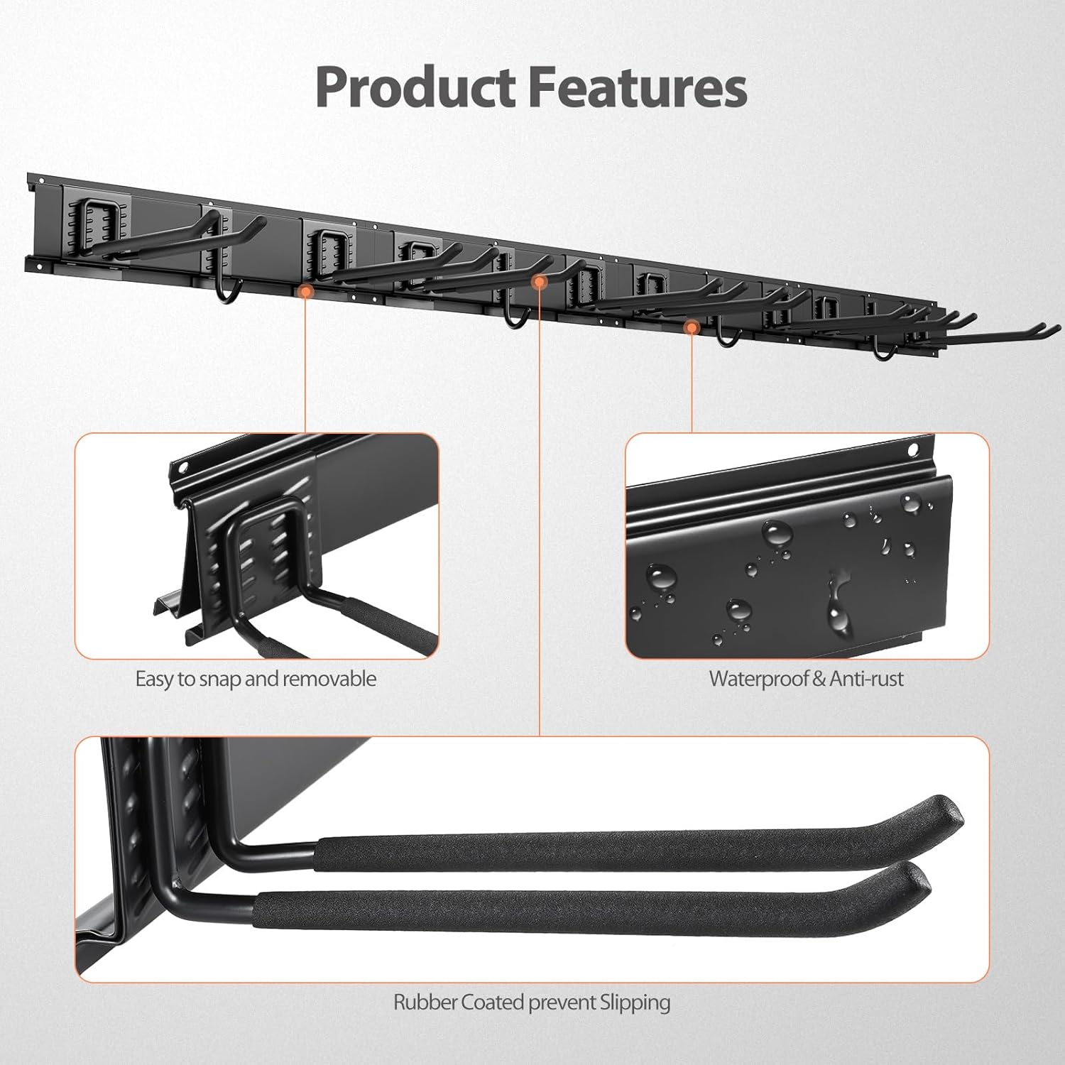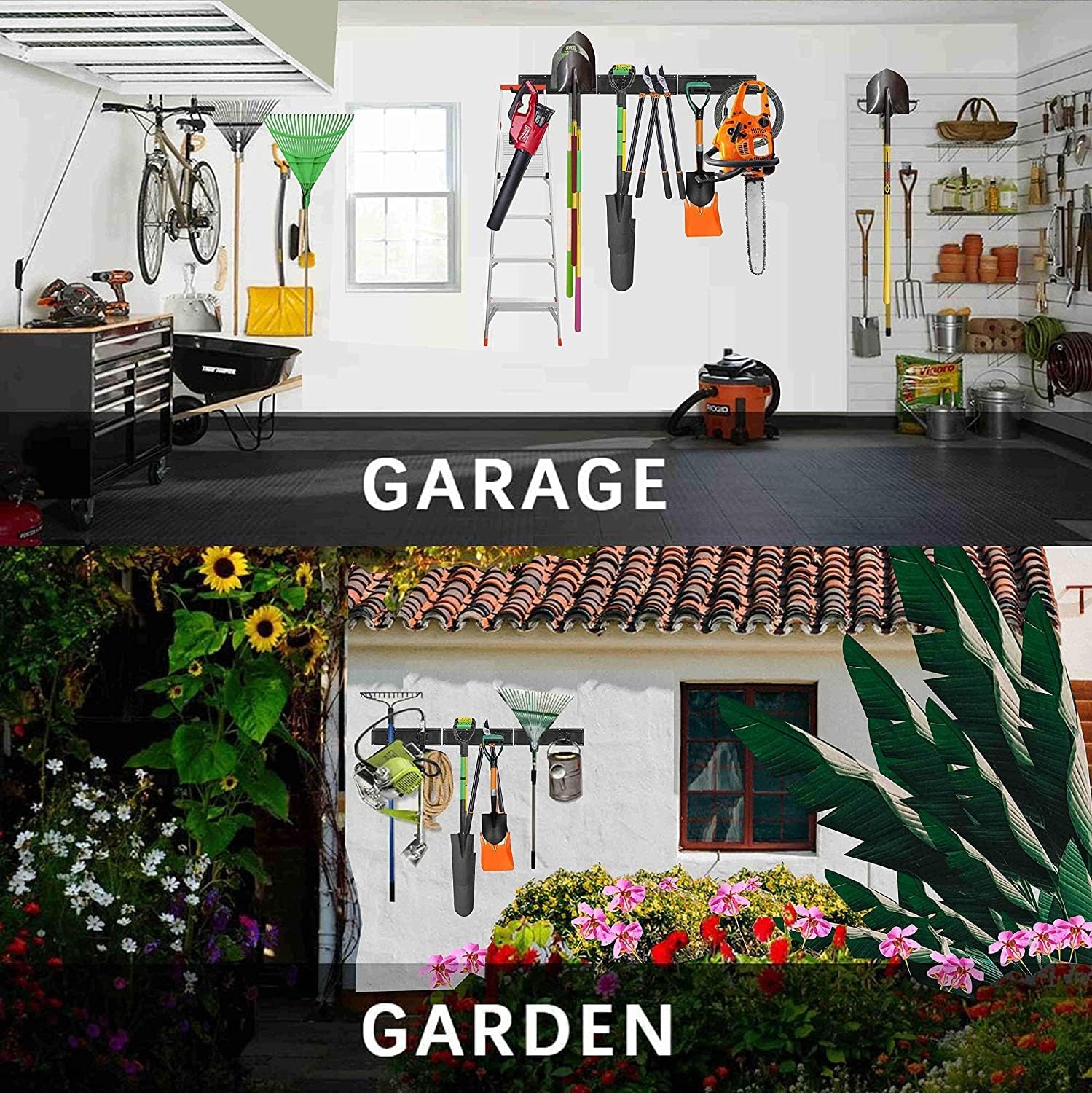 • VERSATILE WALL STORAGE SYSTEM: Our multifunctional tool storage rack accommodates a wide range of items, including garden tools, shovels, rakes, brooms, mops, extension cords, hoses, power tools, chairs, ladders, and sporting equipment. Effectively optimizing your storage space while keeping everything easily accessible and organized.
