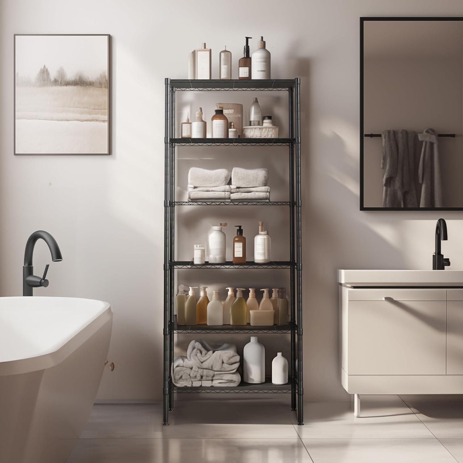 • RELIABLE & STURDY CONSTRUCTION - NSF Certified to ensure the quality. 250 lbs loading capacity per shelf with leving feet (evenly distributed) totally 1500 lbs, perfect for home use. Wire shelves adjustable in 1-inches to meet your different storage needs.