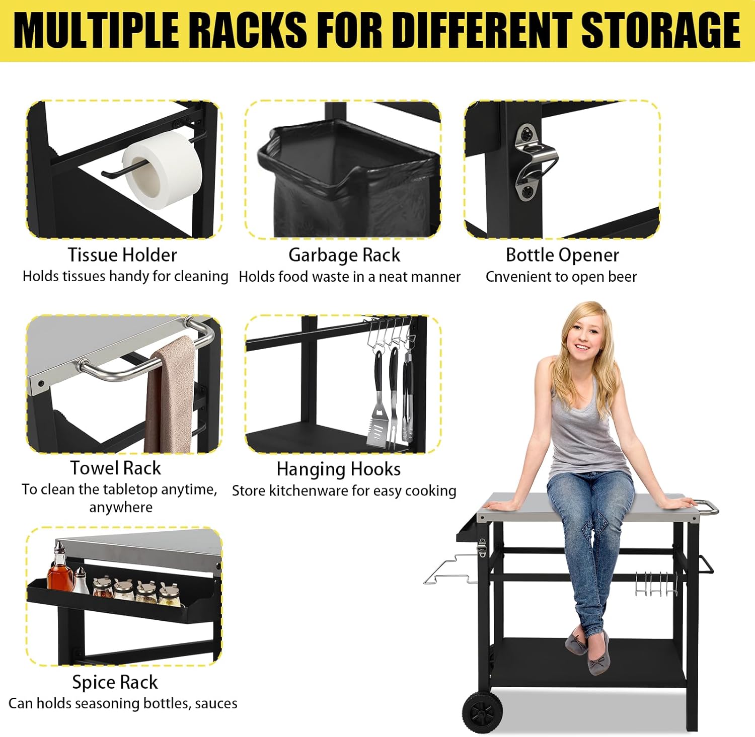 • 【Large Storage】This grill table has two big storage parts, giving you plenty of space for added convenience when organizing and transporting your items. In addition, there has three tool hooks, side spice holder , paper tissue holder, towel rack, garbage rack, bottle opener, etc.