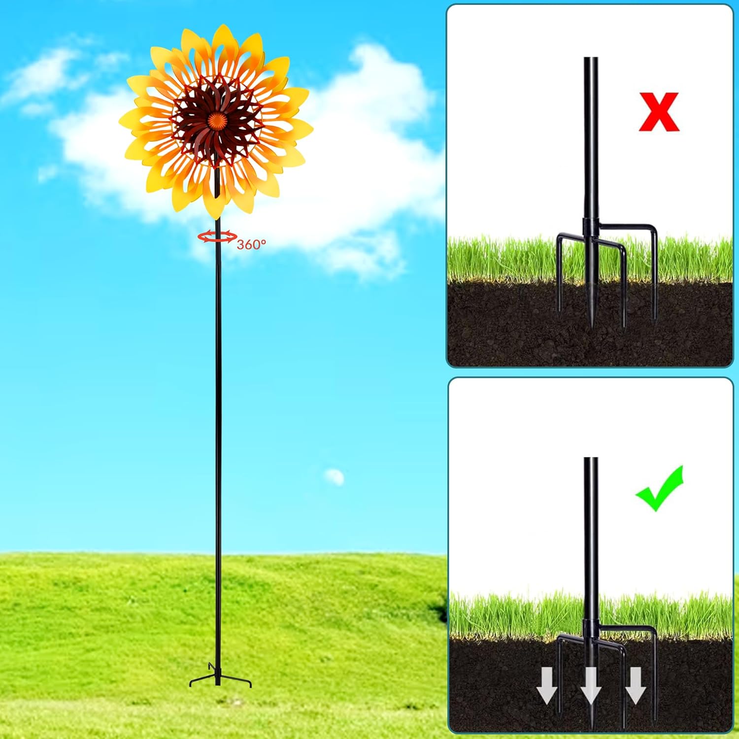Sunflower Wind Spinners, 360 Degrees Swivel Metal Wind Sculptures, 76" Large Garden Pinwheels for Yard Lawn Patio Decor