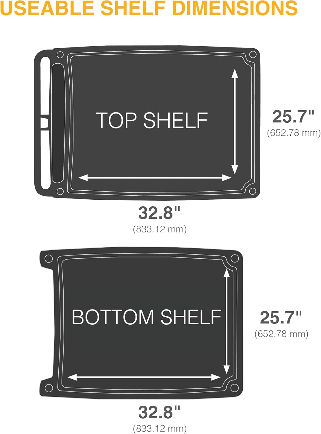 • Built to Handle the Toughest Loads: Maximize storage efficiency in any space with this heavy-duty 2-shelf hauler. With a maximum weight capacity of 400 lbs (181 kg), this cart allows you to conquer tough storage challenges. Each shelf boasts up to a 200 lbs (90 kg) load capacity of tools, supplies, or equipment, keeping everything organized and readily accessible.