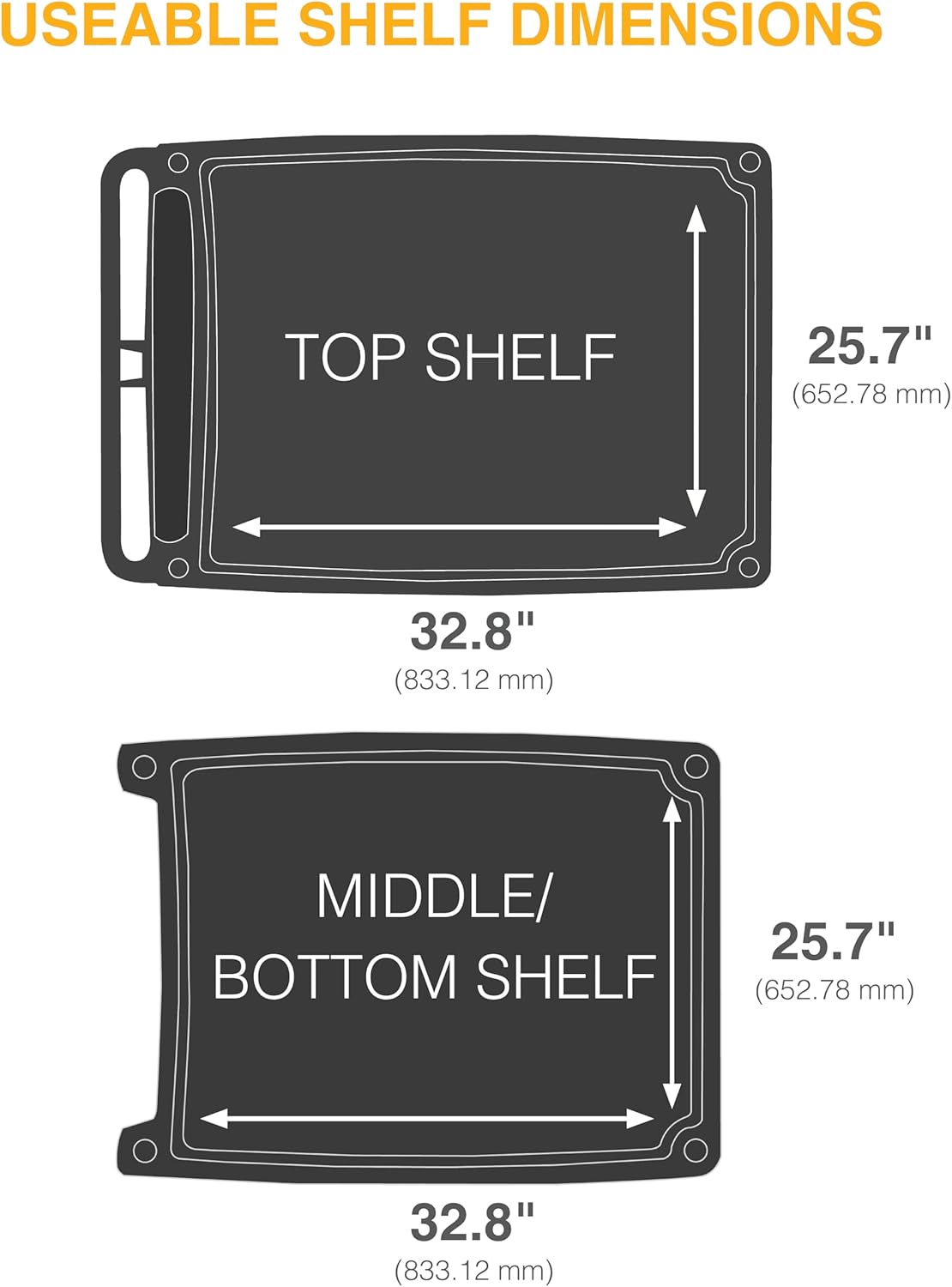 • Built to Handle the Toughest Loads: Triple your storage solutions with this heavy-duty 3-shelf hauler. With a maximum weight capacity of 500 lbs (227 kg), this cart allows you to conquer even the most demanding storage challenges. Each shelf boasts up to a 200 lbs (90 kg) load capacity of tools, supplies, or equipment, keeping everything organized and readily accessible.