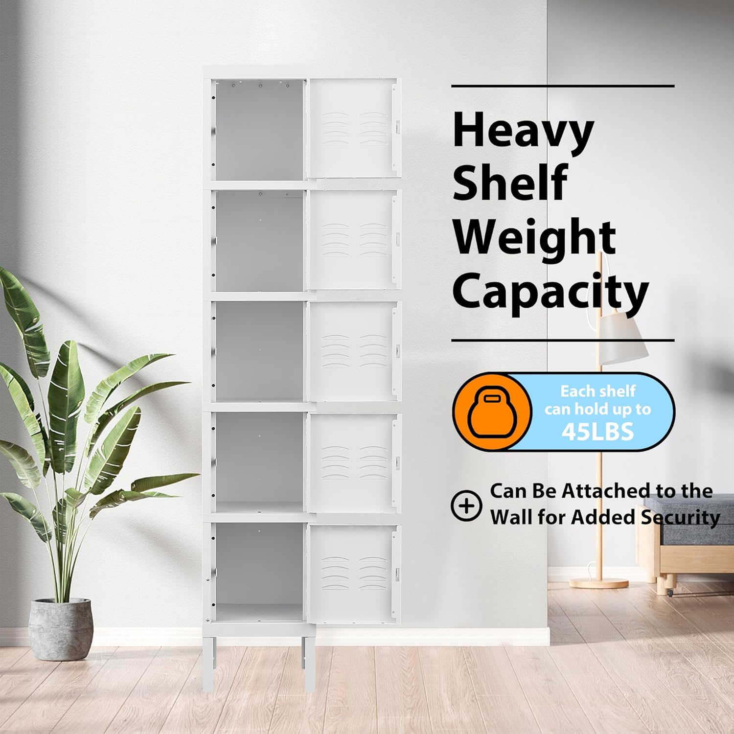 • 【Large Storage Capacity】: Metal Locker 65.98"H x 12"W x 12"D. Equipped with 5 separate compartments, it can meet your needs for storing different sized items and meet most of your daily needs. Such as books, clothes, sporting goods, shoes, backpacks, etc.