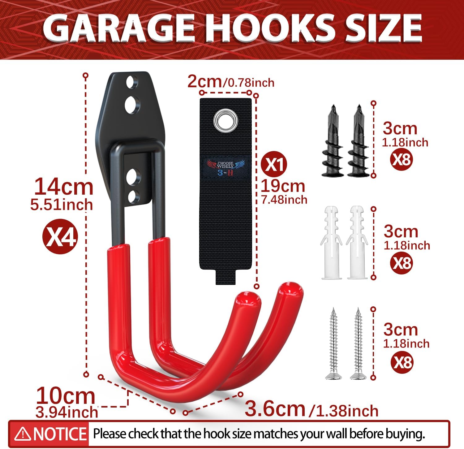 3-H Garden Hose Holder Wall Mount 4 Pack,Solid Steel Hose Hanger,Water Hose Holders for Outside,Perfect for Hanging Outdoor Air Hose,Ropes,Pipes,Garden Tools,Ladders,Bikes,Bulk Items(Red)