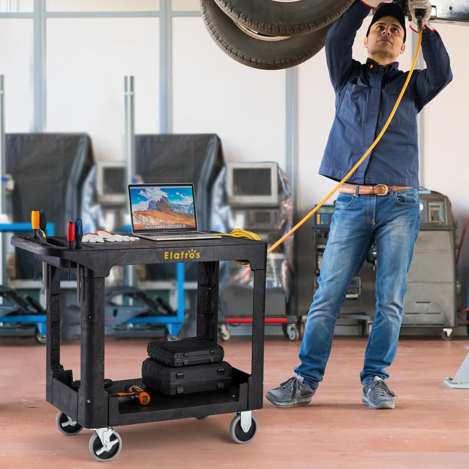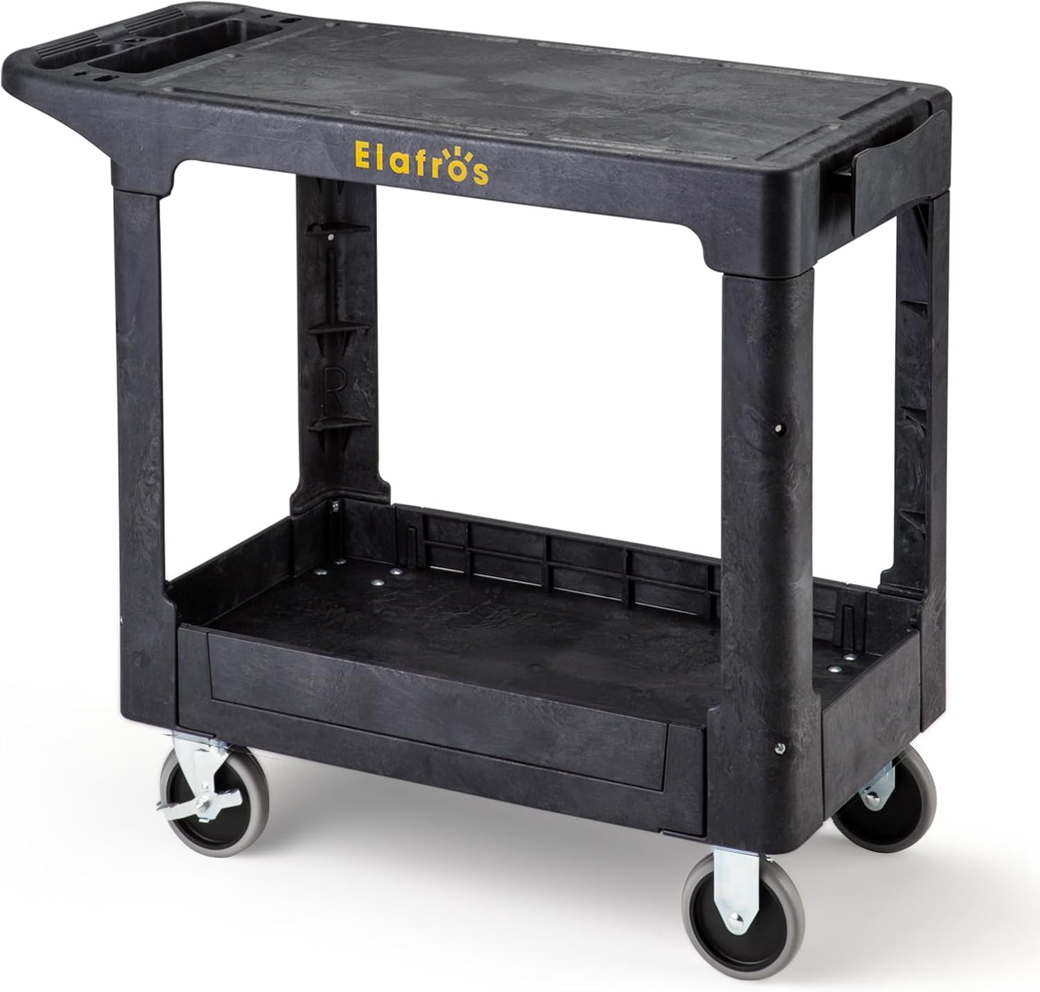 ELAFROS Heavy Duty Plastic Utility Cart Flat top 37 x 18.8 Inch - Work Cart Flat Shelves and 2 Fixed 2 Swivel Wheels Safely Holds up to 550 lbs - 2 Tier Service Cart for Warehouse,Garage, Black