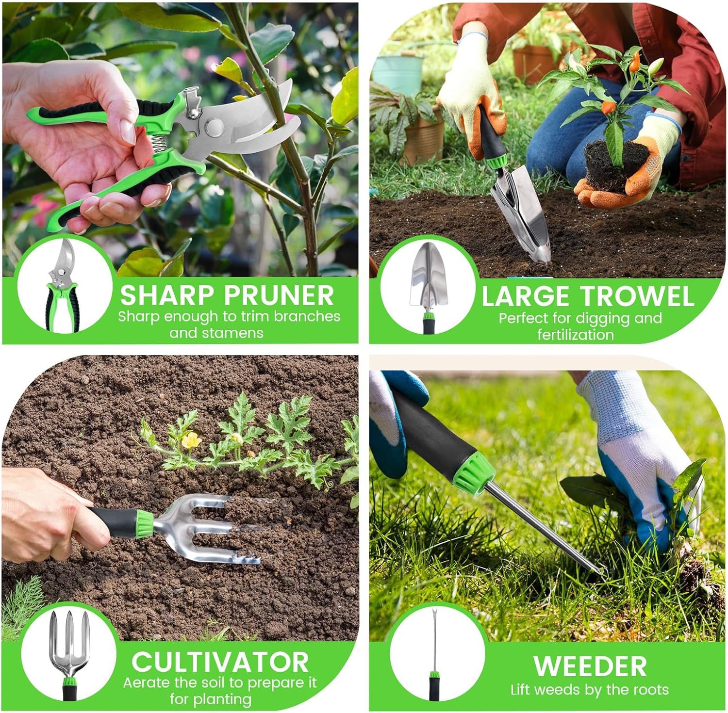 • 【Two Removable tool bag & 4 Heavy Duty Garden Tools】 The gardening tool sets includes a large trowel, cultivator, weeder, pruning shears and an Oxford cloth Tool hand bag+tool pouch to keep all your tools packed away provides everything you need to maintain a beautiful and healthy garden.