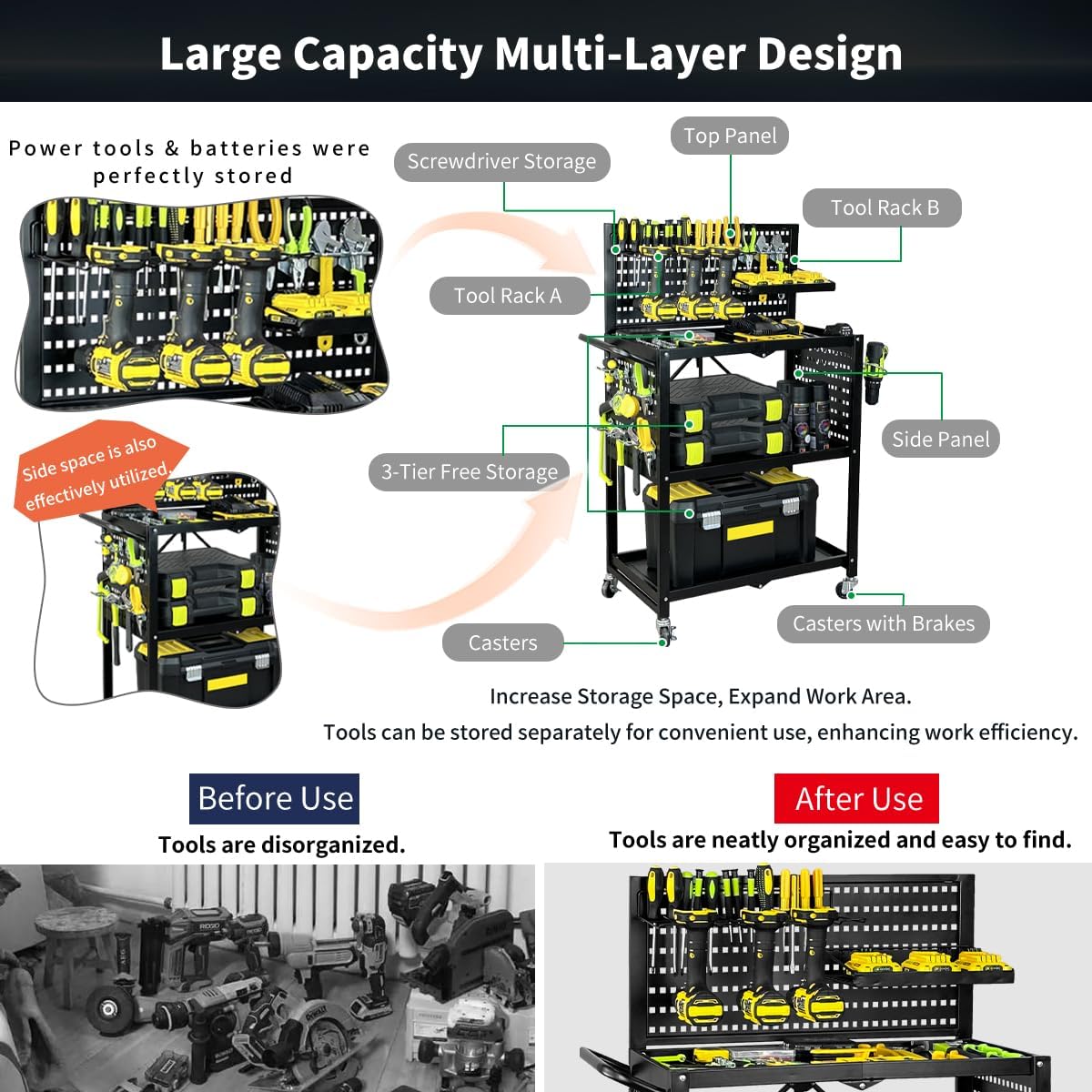 • 【Cart + Hook Combo】 Comes with pegboard hooks for customized tool storage, offering flexible power tool organization.
