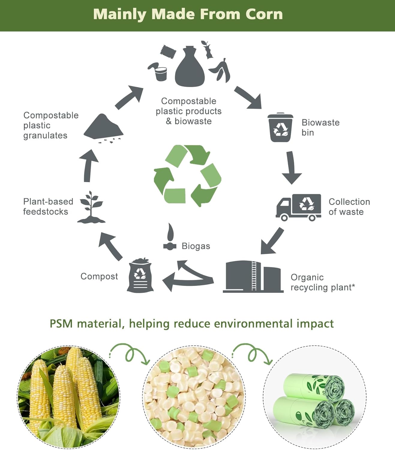 • From Corn to Compost: AYOTEE compostable small trash bags 1.6 gallon are made from plant-based materials, mainly corn starch, to ensure they do no harm to the environment. These compost bin bags meet ASTM series compostable standards and can be quickly degrade in municipal industrial composting facilities (under constant humidity at 50-60°C) to eventually return to the earth in the form of water, CO2 and biomass