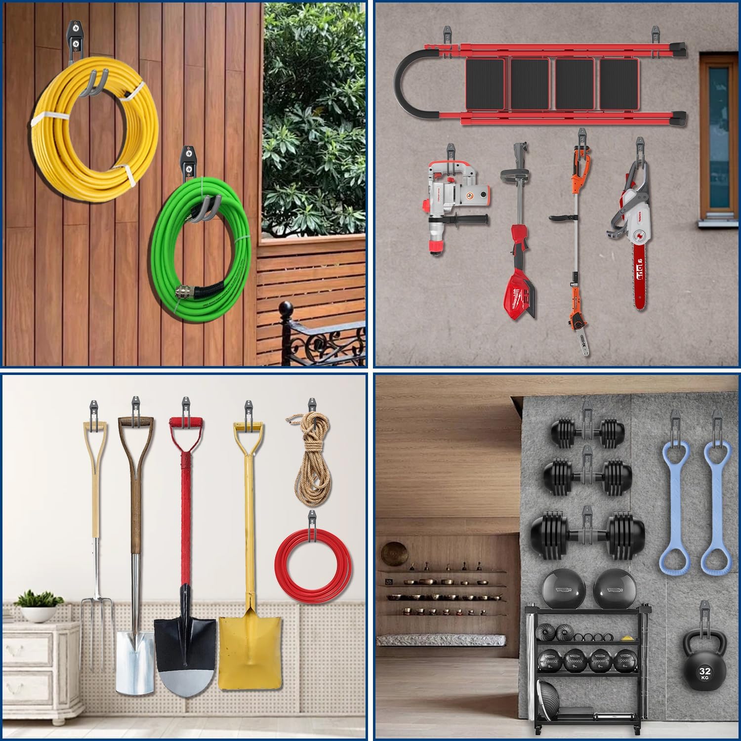 • Multi-Use Hose Hanger Wall Mount: You will receive 4 large hose reel wall mount and 1 extension cord storage straps. This steel wall mount hose reel, ideal for organizing gardens, shops, sheds, yards, and garages, keeps various tools in order, thereby saving you more space. Our outdoor hose holder is suitable for hanging items such as cables, air hoses, ladders, chairs, brooms, shovels, and power tools