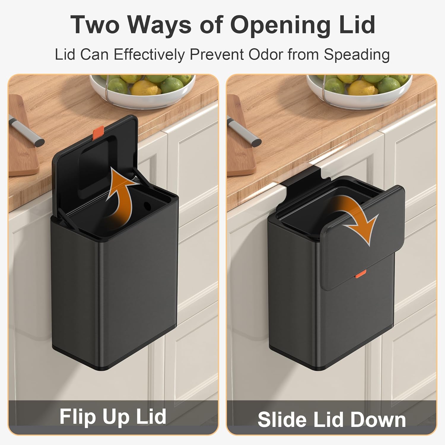 • 【WALL MOUNTED/COUNTERTOP/ UNDER SINK TRASH CAN】No need to bend over. The trash can provide Two opening and installation methods,Effortless and Fits for Most Cabinet Doors, Pantry Doors. The thickness of door should be less than 0.98" (2.5 cm). Small trash can can also be glued on kitchen or bathroom wall or under the sink