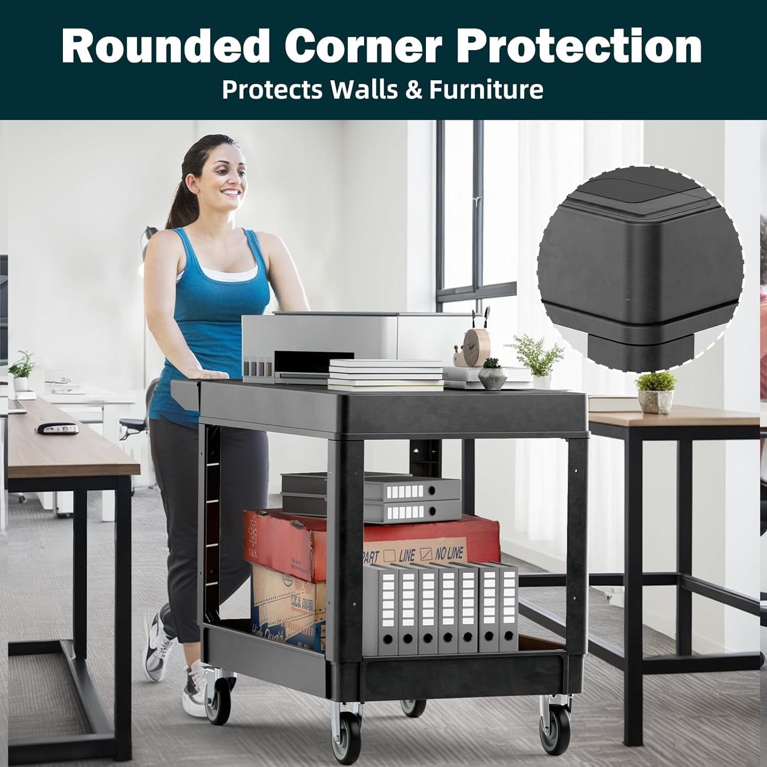 • 【Rounded Corners】Designed with rounded corners, our utility cart on wheels protects walls and furniture from bumps and damage, making it ideal for indoor use in places like offices and schools.