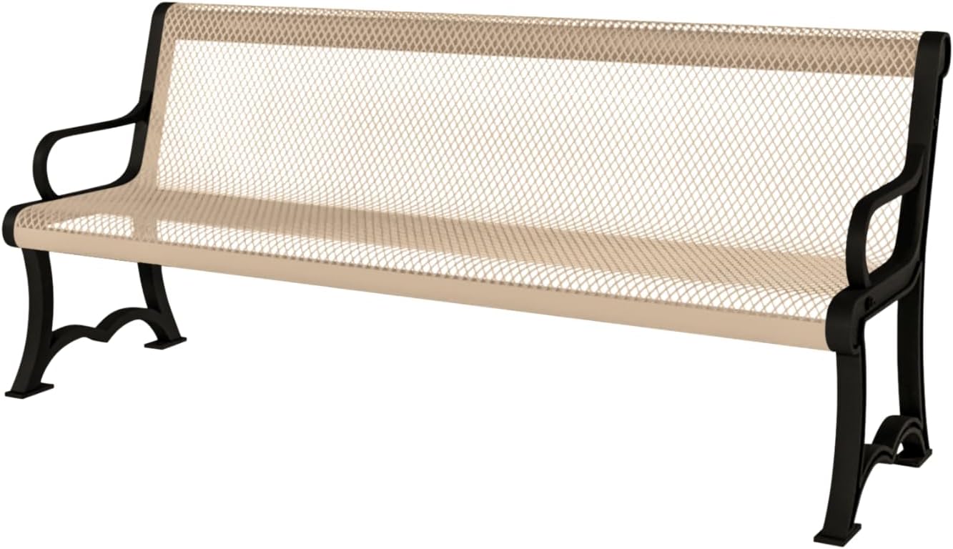 Coated Outdoor Furniture Heavy-Duty Outdoor Bench Thermoplastic Coated, Expanded Metal, Commercial-Grade Garden Bench, Made in America (Portable with Back, 4 Ft, Tan)
