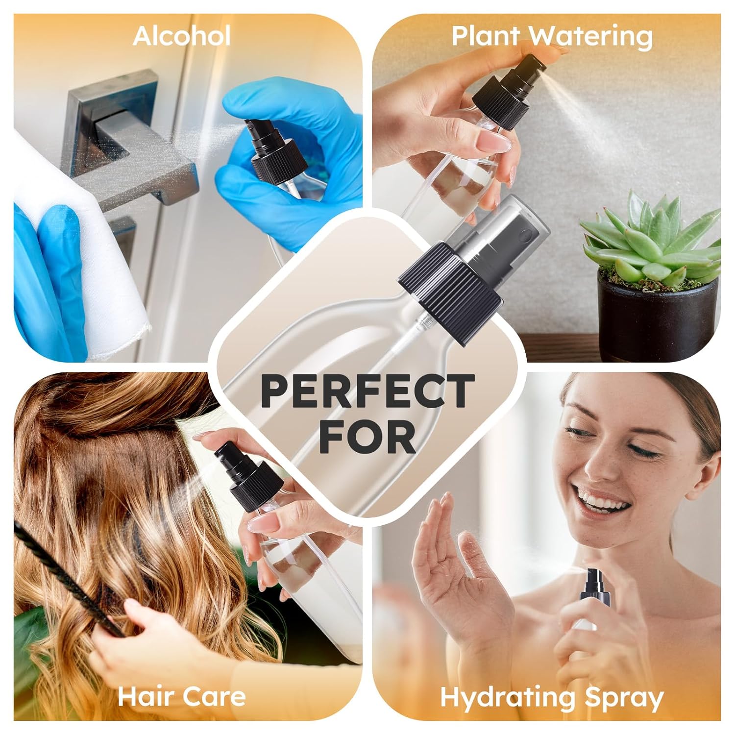 • Multifunctional Squirt Bottle: The mister spray bottles can fill with whatever liquid you want. Perfect for water spray bottle for hair, homemade cleaning solutions, window Cleaners Aromatherapy Facial Hydration Watering Flowers Hair Care, and so on.