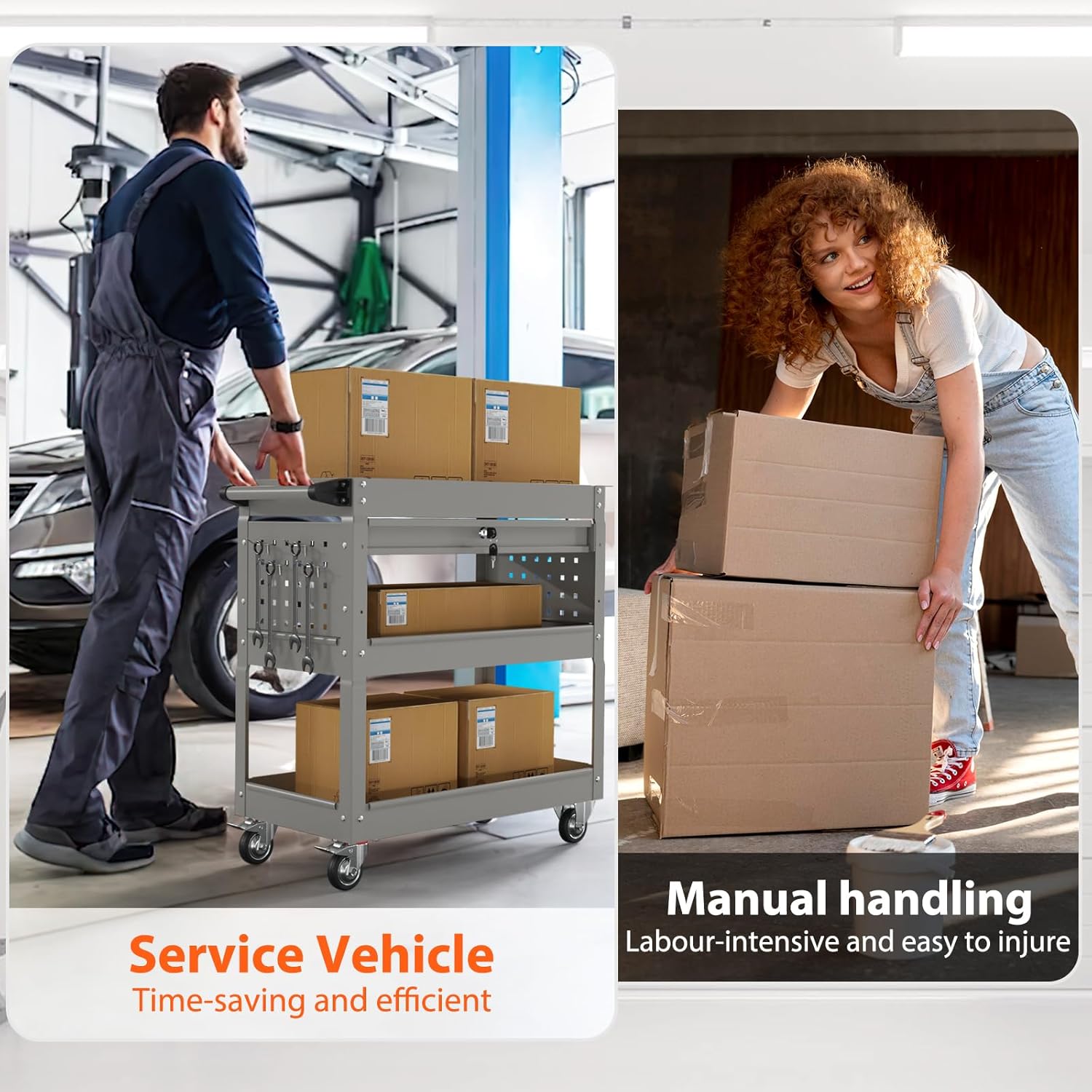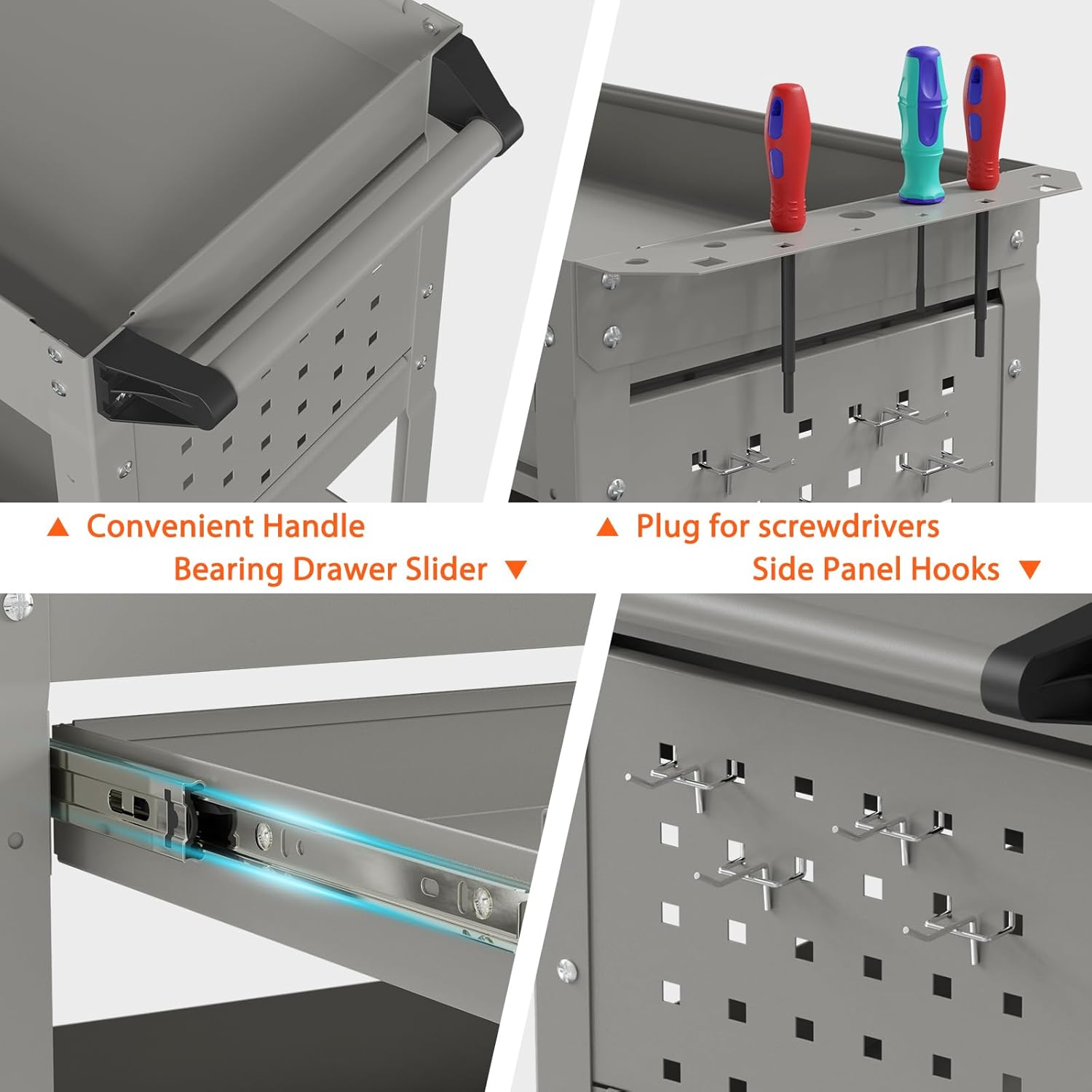• 🔨【Easy to Move】: The tool cart on wheels is equipped with 2 universal wheels, 2 fixed wheels, plus a handle, so you can move the tool cart easily. Two universal wheels with a braking function and sidebar can help you easily move the tool cart to where you want to go and place it steadily.