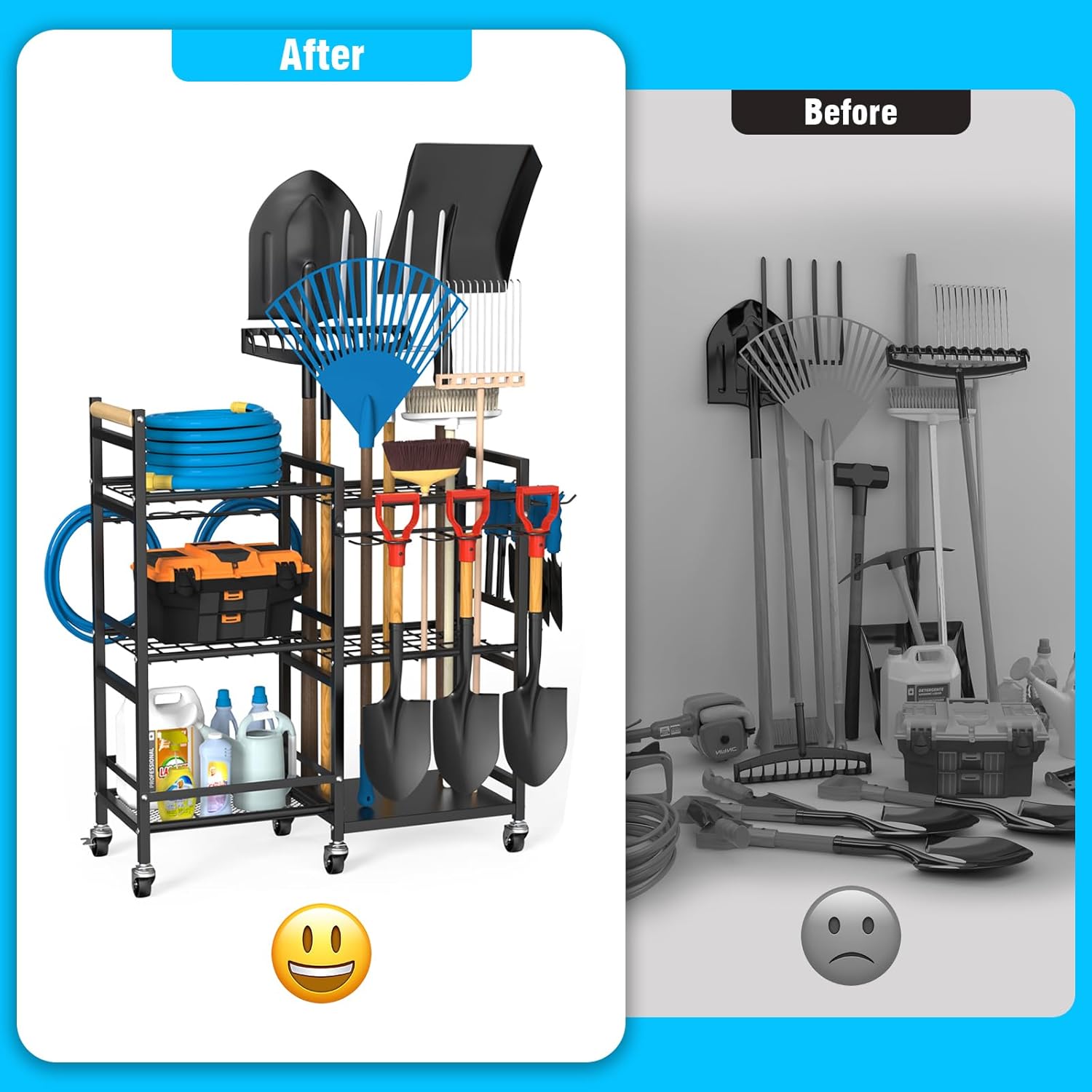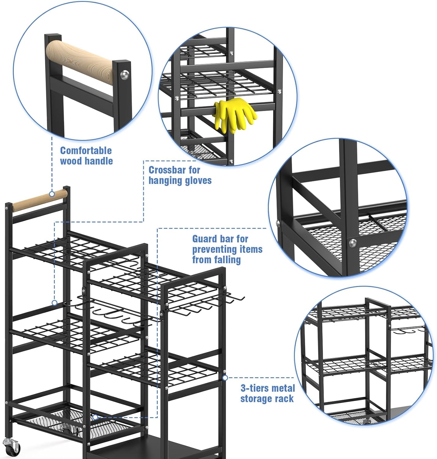 NADAMOO Garden Tool Organizer with Rolling Wheel, 3-tier Metal Shelf Yard Tool Holder, Utility Stand Rack for Garage Organization and Storage, Hold Long-Handled Rakes, Shovel, Broom
