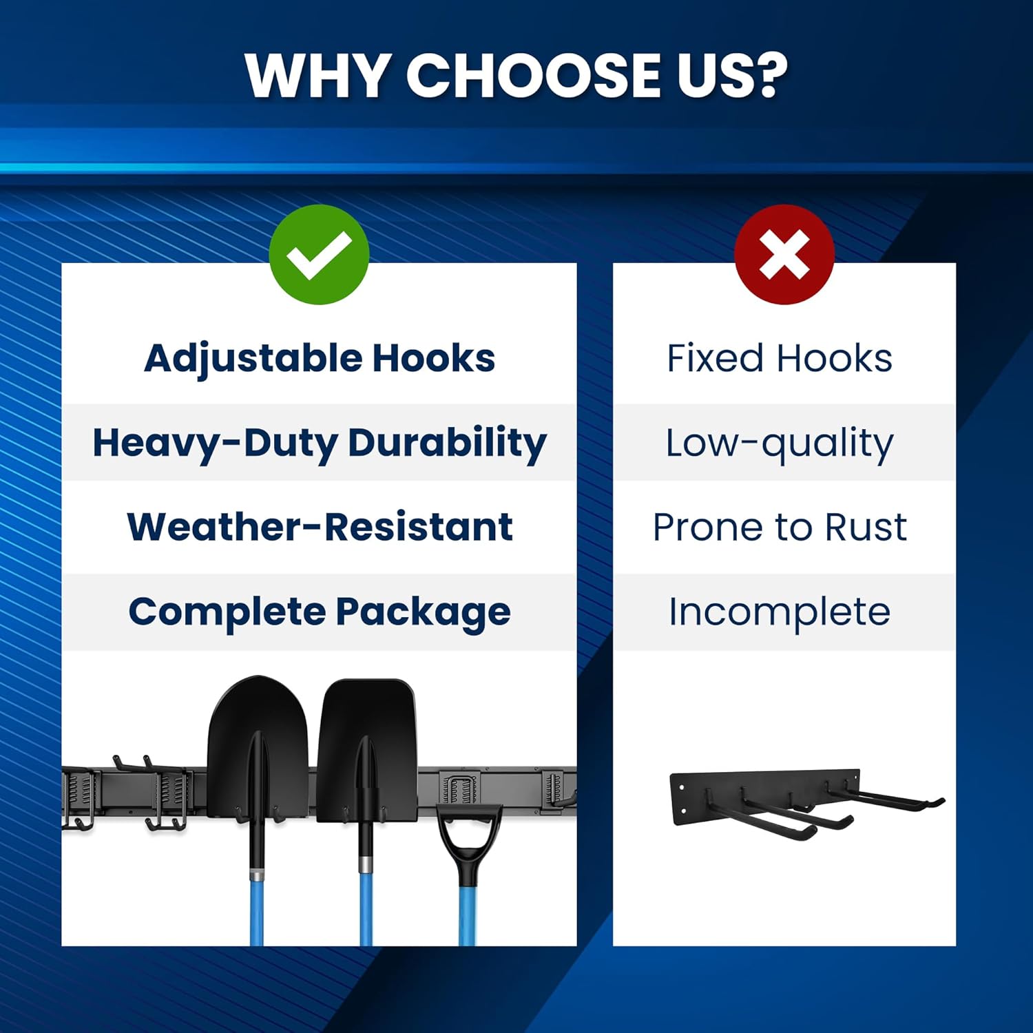 • Quick and Easy Installation: This garden tool organizer wall mount comes with all necessary hardware and straightforward instructions, making it simple to install and organize your garage or shed in minutes.